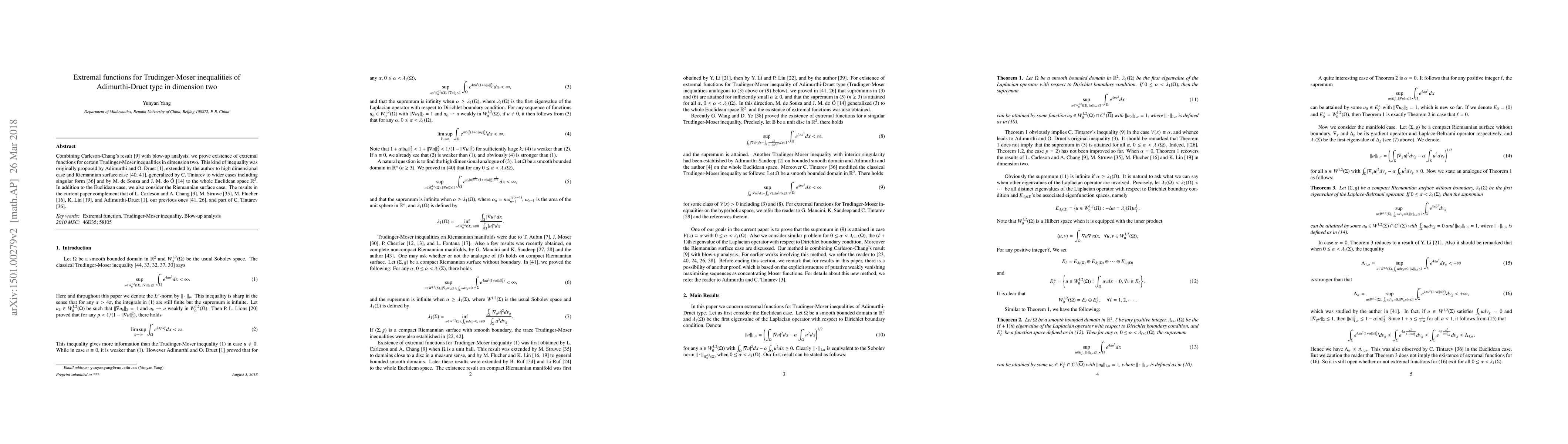 This paper proves the existence of extremal functions for Trudinger-Moser inequalities in dimension two, combining Carleson-Chang's result with blow-up analysis. The study extends previous work by Adimurthi-Druet, Tintarev, and others, and complements results in both Euclidean and Riemannian surface cases.