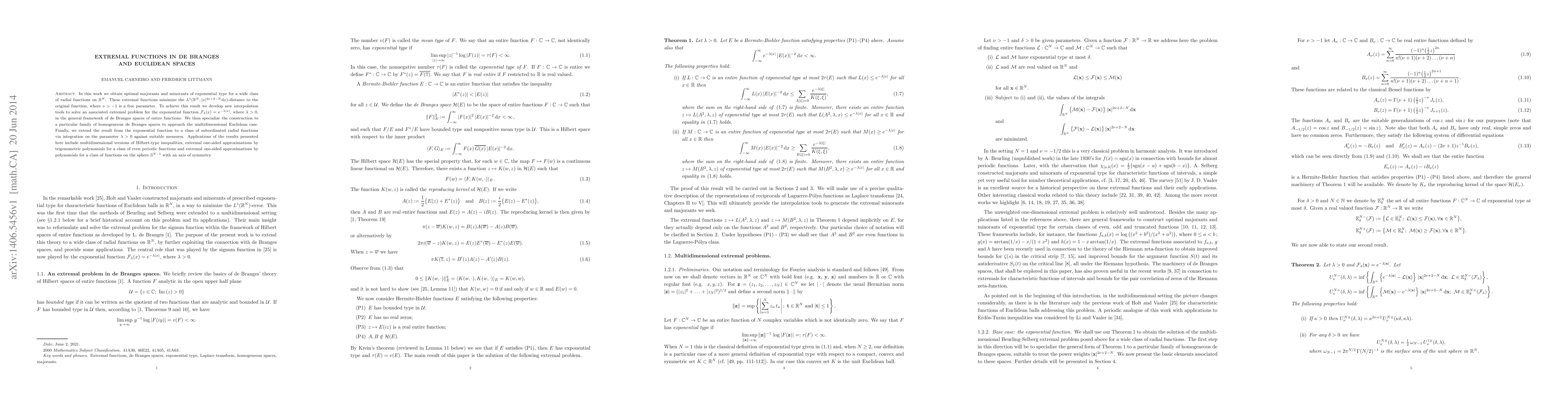 This paper develops optimal majorants and minorants of exponential type for radial functions in $\mathbb{R}^N$, utilizing new interpolation tools to solve extremal problems in de Branges spaces and extending results to multidimensional Euclidean cases, with applications to Hilbert-type inequalities and extremal approximations.