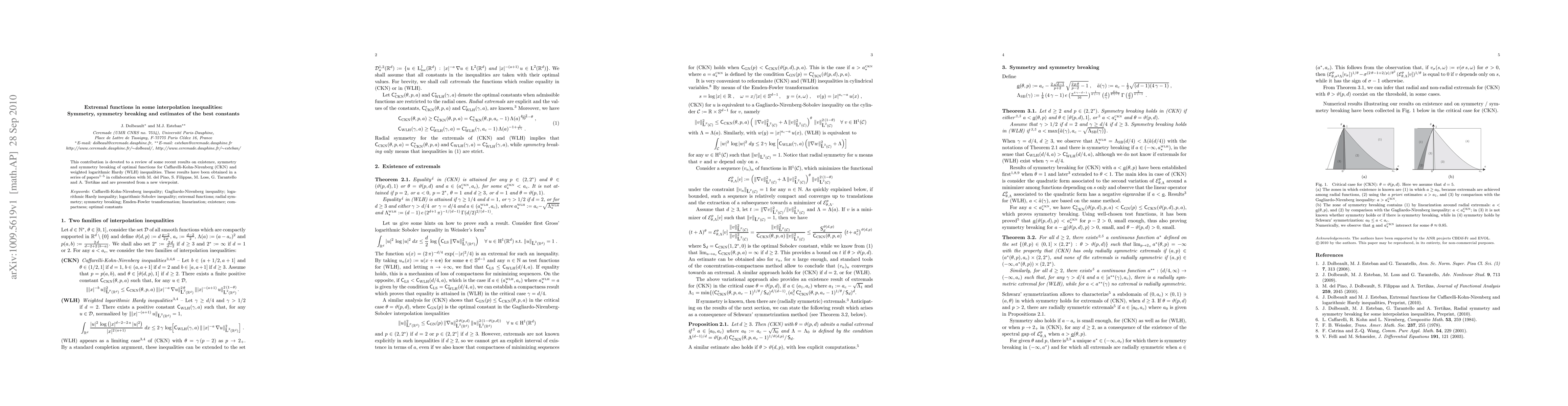 This paper reviews recent findings on the optimal functions for Caffarelli-Kohn-Nirenberg and weighted logarithmic Hardy inequalities, focusing on their symmetry, symmetry breaking, and the estimation of best constants. Collaborative efforts with several researchers have provided new insights into these interpolation inequalities.