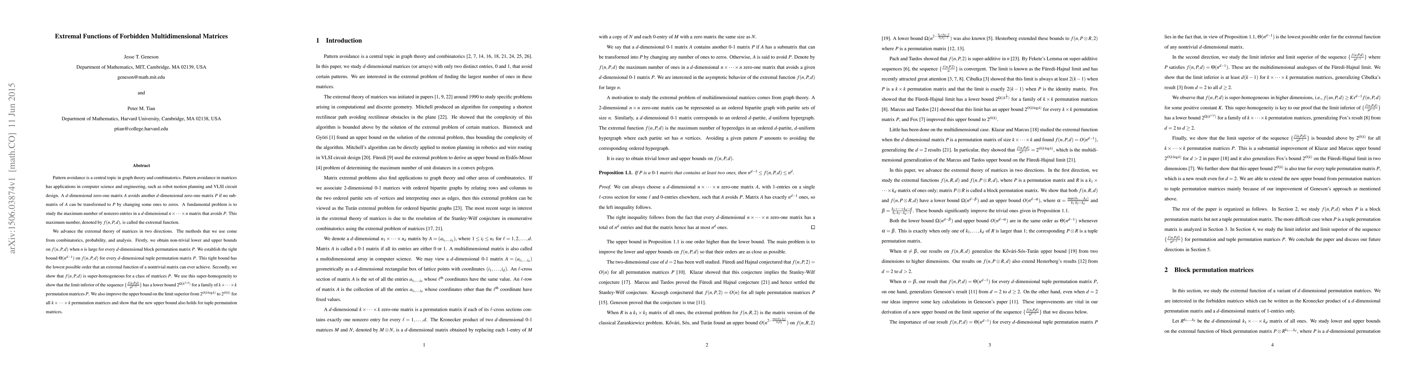 Pattern avoidance is a central topic in graph theory and combinatorics. Pattern avoidance in matrices has applications in computer science and engineering, such as robot motion planning and VLSI circuit design. A $d$-dimensional zero-one matrix $A$ avoids another $d$-dimensional zero-one matrix $P$ if no submatrix of $A$ can be transformed to $P$ by changing some ones to zeros. A fundamental problem is to study the maximum number of nonzero entries in a $d$-dimensional $n \times \cdots \times n$ matrix that avoids $P$. This maximum number, denoted by $f(n,P,d)$, is called the extremal function. We advance the extremal theory of matrices in two directions. The methods that we use come from combinatorics, probability, and analysis. Firstly, we obtain non-trivial lower and upper bounds on $f(n,P,d)$ when $n$ is large for every $d$-dimensional block permutation matrix $P$. We establish the tight bound $\Theta(n^{d-1})$ on $f(n,P,d)$ for every $d$-dimensional tuple permutation matrix $P$. This tight bound has the lowest possible order that an extremal function of a nontrivial matrix can ever achieve. Secondly, we show that $f(n,P,d)$ is super-homogeneous for a class of matrices $P$. We use this super-homogeneity to show that the limit inferior of the sequence $\{ {f(n,P,d) \over n^{d-1}}\}$ has a lower bound $2^{\Omega(k^{1/ d})}$ for a family of $k \times \cdots \times k$ permutation matrices $P$. We also improve the upper bound on the limit superior from $2^{O(k \log k)}$ to $2^{O(k)}$ for all $k \times \cdots \times k$ permutation matrices and show that the new upper bound also holds for tuple permutation matrices.