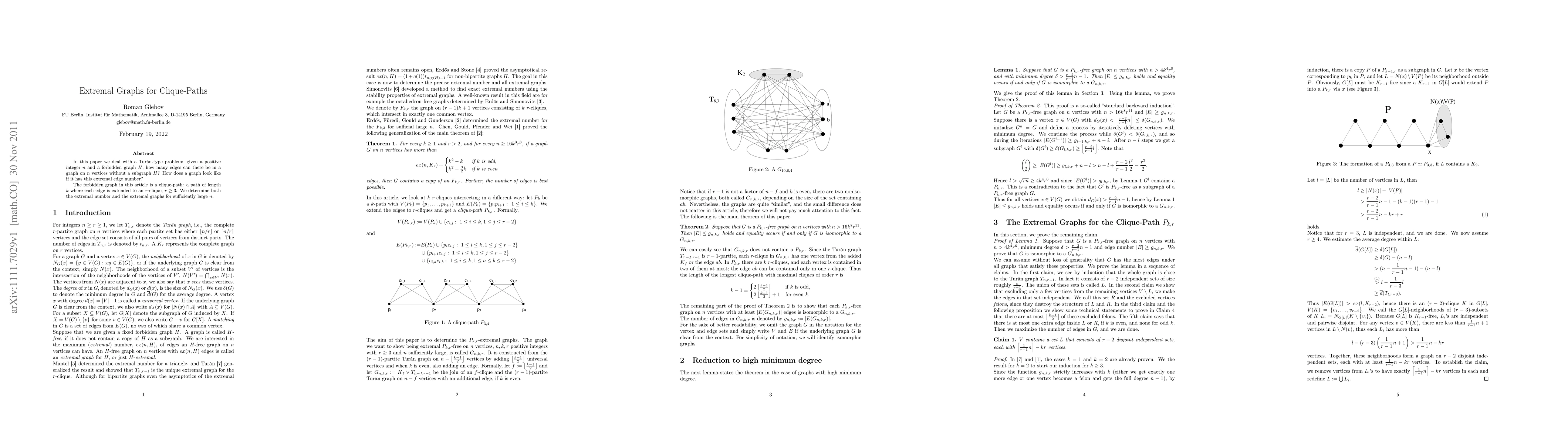 This paper addresses a Turán-type problem concerning the maximum number of edges in a graph on n vertices that avoids a specific forbidden subgraph—a clique-path, where each edge extends to an r-clique (r > 2). The authors determine both the extremal edge count and the structure of the corresponding extremal graphs for large n.
