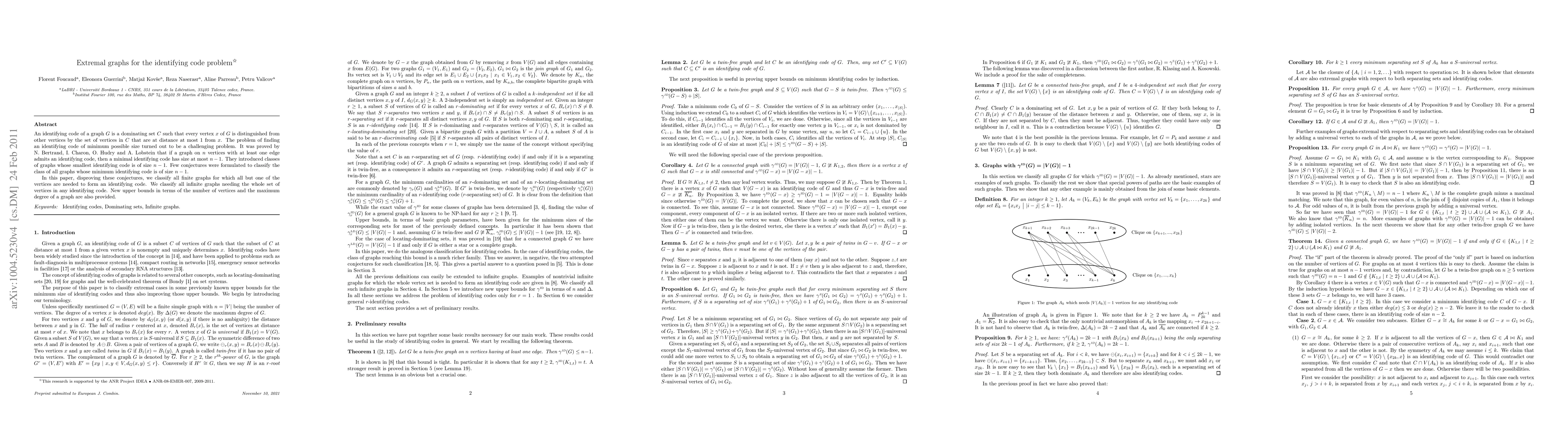 An identifying code of a graph G is a dominating set C such that every vertex x of G is distinguished from all other vertices by the set of vertices in C that are at distance at most 1 from x. The problem of finding an identifying code of minimum possible size turned out to be a challenging problem. It was proved by N. Bertrand that if a graph on n vertices with at least one edge admits an identifying code, then a minimum identifying code has size at most n-1. Some classes of graphs whose smallest identifying code is of size n-1 were already known, and few conjectures were formulated to classify all these graphs. In this paper, disproving these conjectures, we classify all finite graphs for which all but one of the vertices are needed to form an identifying code. We also classify all infinite graphs needing the whole set of vertices in any identifying code. New upper bounds in terms of the number of vertices and the maximum degree of a graph are also provided.
