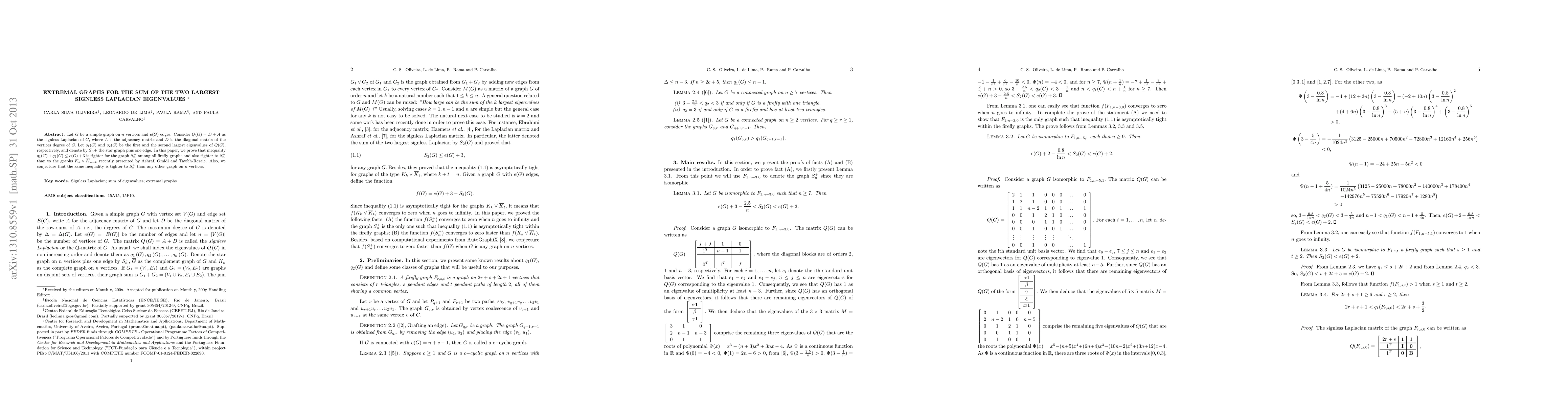 This paper investigates extremal graphs for the sum of the two largest eigenvalues of the signless Laplacian matrix, proving that the star graph plus one edge ($S_{n}^{+}$) is the tightest among firefly graphs and other recently proposed graphs for the inequality $q_1(G) + q_2(G) \leq e(G) + 3$. The authors also conjecture that $S_{n}^{+}$ is the tightest for this inequality among all graphs on $n$ vertices.