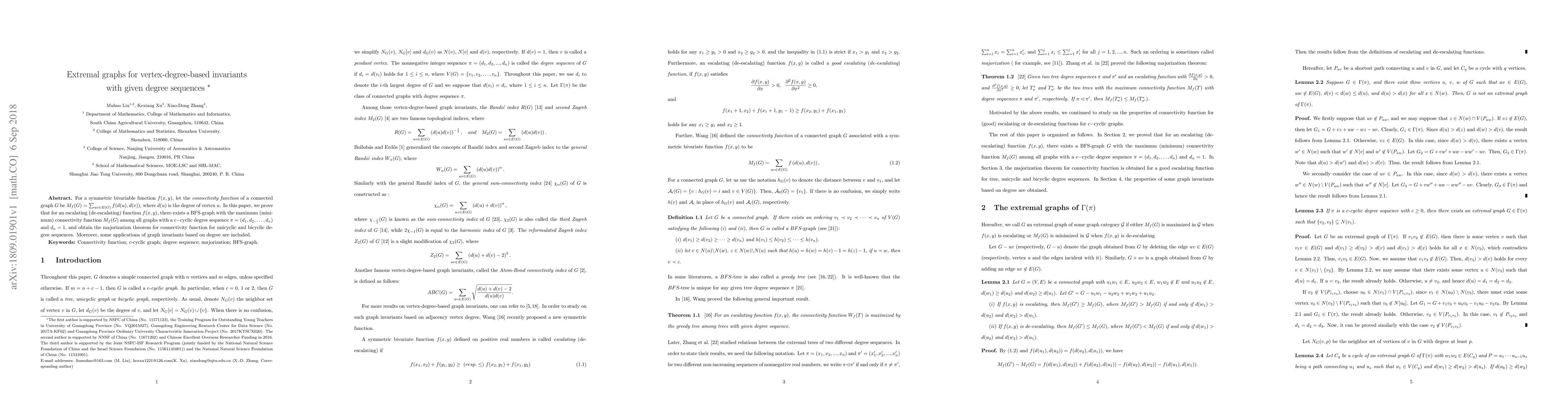 The paper proves that for specific types of functions, there exists a graph with maximum or minimum connectivity function among all graphs with given degree sequences, providing new insights into vertex-degree-based invariants.