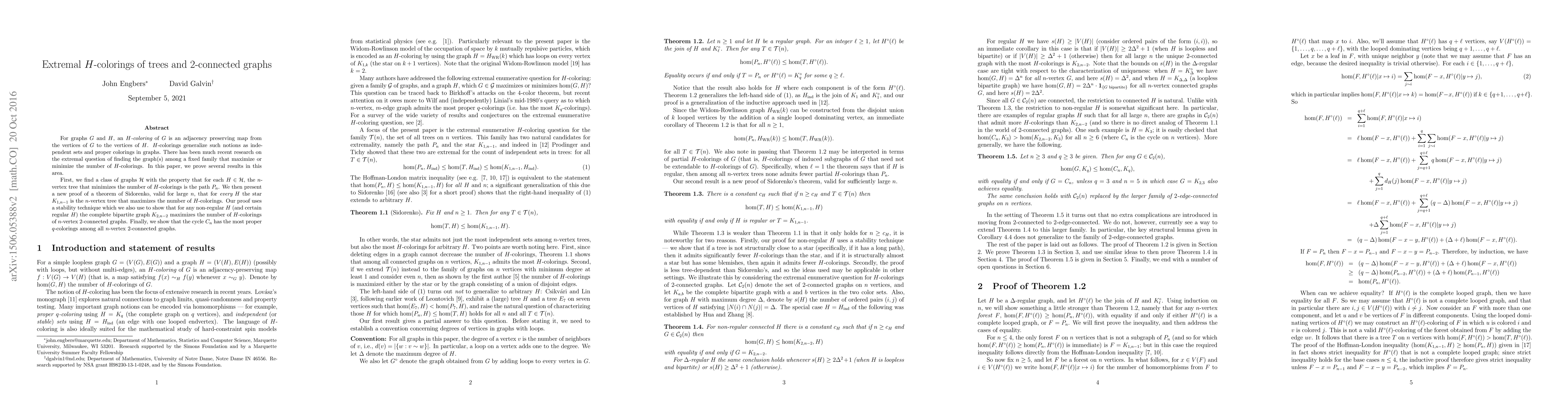 For graphs $G$ and $H$, an $H$-coloring of $G$ is an adjacency preserving map from the vertices of $G$ to the vertices of $H$. $H$-colorings generalize such notions as independent sets and proper colorings in graphs. There has been much recent research on the extremal question of finding the graph(s) among a fixed family that maximize or minimize the number of $H$-colorings. In this paper, we prove several results in this area. First, we find a class of graphs ${\mathcal H}$ with the property that for each $H \in {\mathcal H}$, the $n$-vertex tree that minimizes the number of $H$-colorings is the path $P_n$. We then present a new proof of a theorem of Sidorenko, valid for large $n$, that for every $H$ the star $K_{1,n-1}$ is the $n$-vertex tree that maximizes the number of $H$-colorings. Our proof uses a stability technique which we also use to show that for any non-regular $H$ (and certain regular $H$) the complete bipartite graph $K_{2,n-2}$ maximizes the number of $H$-colorings of $n$-vertex $2$-connected graphs. Finally, we show that the cycle $C_n$ maximizes the number of proper colorings of $n$-vertex $2$-connected graphs.