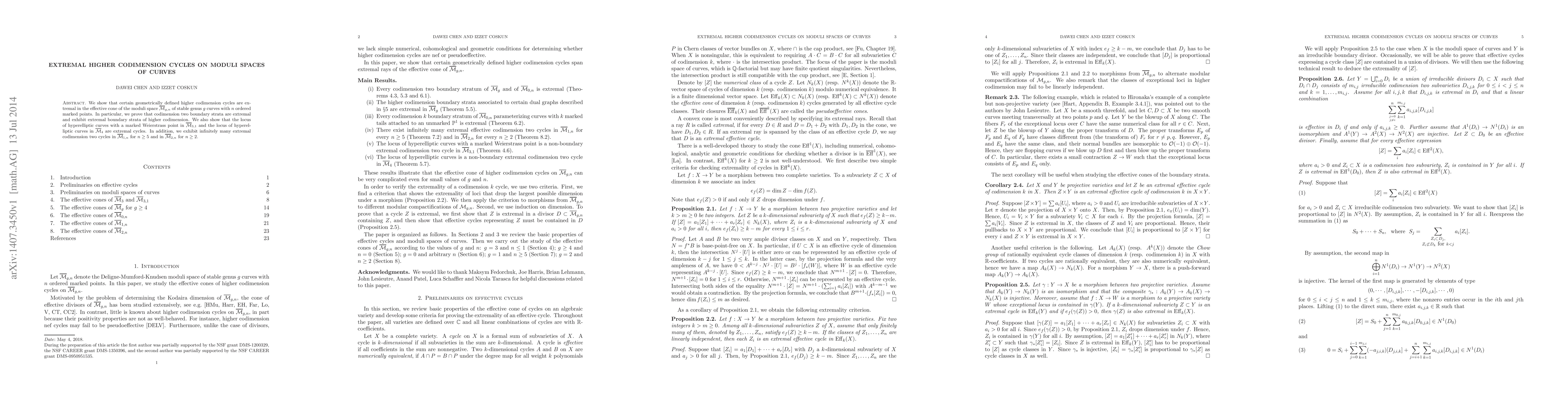 The paper demonstrates that specific higher codimension cycles in moduli spaces of stable genus curves are extremal in the effective cone, including codimension two boundary strata and certain hyperelliptic curves. It also finds infinitely many extremal cycles in specific moduli spaces.