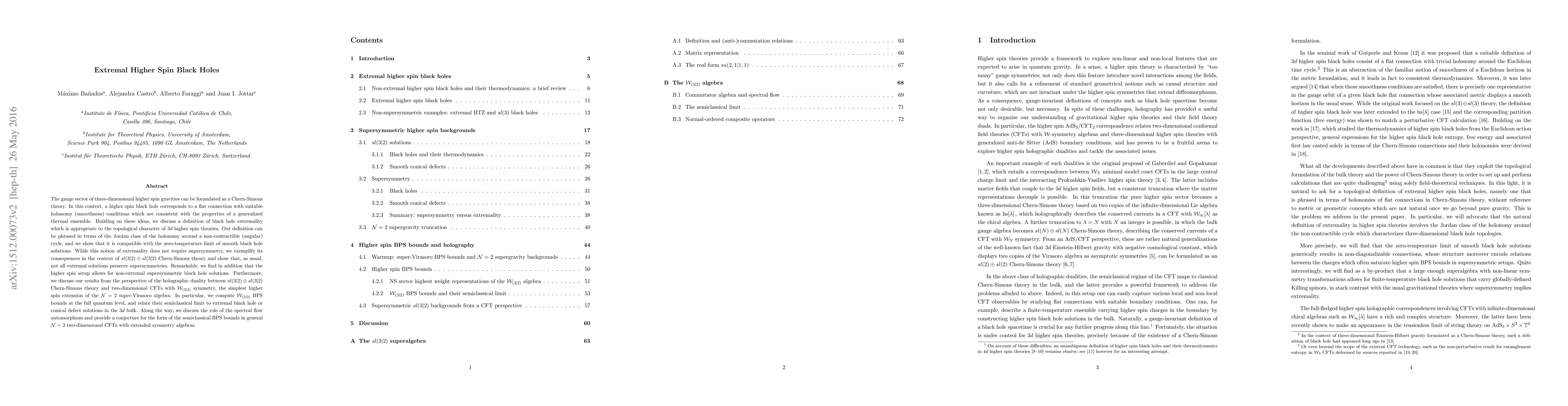 The gauge sector of three-dimensional higher spin gravities can be formulated as a Chern-Simons theory. In this context, a higher spin black hole corresponds to a flat connection with suitable holonomy (smoothness) conditions which are consistent with the properties of a generalized thermal ensemble. Building on these ideas, we discuss a definition of black hole extremality which is appropriate to the topological character of 3d higher spin theories. Our definition can be phrased in terms of the Jordan class of the holonomy around a non-contractible (angular) cycle, and we show that it is compatible with the zero-temperature limit of smooth black hole solutions. While this notion of extremality does not require supersymmetry, we exemplify its consequences in the context of sl(3|2) + sl(3|2) Chern-Simons theory and show that, as usual, not all extremal solutions preserve supersymmetries. Remarkably, we find in addition that the higher spin setup allows for non-extremal supersymmetric black hole solutions. Furthermore, we discuss our results from the perspective of the holographic duality between sl(3|2) + sl(3|2) Chern-Simons theory and two-dimensional CFTs with W_{(3|2)} symmetry, the simplest higher spin extension of the N=2 super-Virasoro algebra. In particular, we compute W_{(3|2)} BPS bounds at the full quantum level, and relate their semiclassical limit to extremal black hole or conical defect solutions in the 3d bulk. Along the way, we discuss the role of the spectral flow automorphism and provide a conjecture for the form of the semiclassical BPS bounds in general N=2 two-dimensional CFTs with extended symmetry algebras.