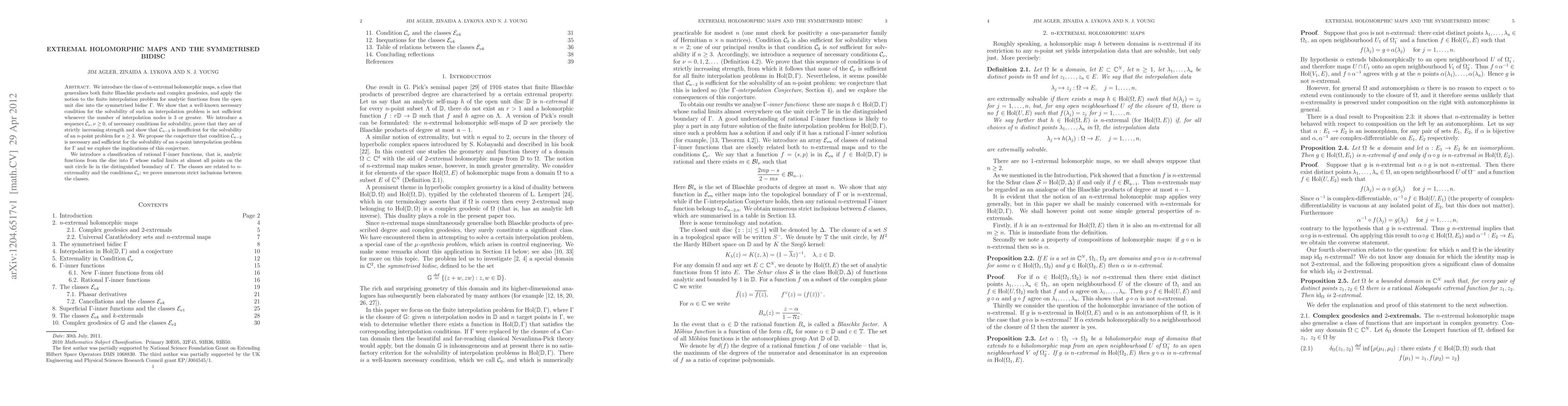 This paper introduces $n$-extremal holomorphic maps, generalizing finite Blaschke products and complex geodesics, and applies them to the interpolation problem for analytic functions from the unit disc into the symmetrised bidisc $\Gamma$. It demonstrates that the well-known necessary condition for solvability is insufficient for $n \geq 3$ and proposes a sequence of stronger conditions $\mathcal{C}_\nu$ that are strictly increasing in strength, suggesting $\mathcal{C}_{n-2}$ as a necessary and sufficient condition for $n$-point interpolation problems.
