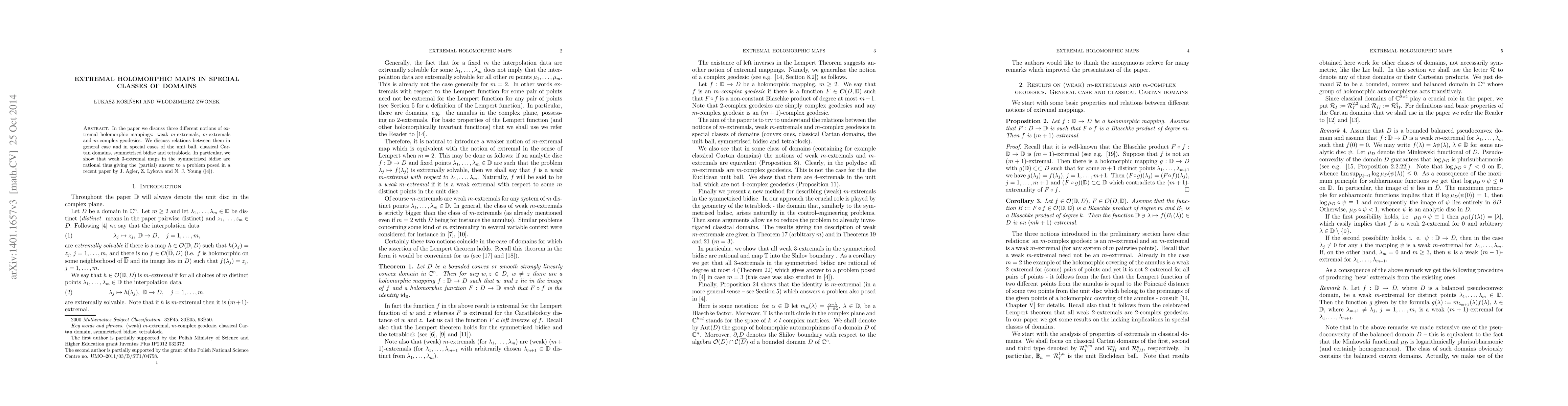 In the paper we discuss three different notions of extremal holomorphic mappings: weak $m$-extremals, $m$-extremals and $m$-complex geodesics. We discuss relations between them in general case and in the special cases of unit ball, classical Cartan domains, symmetrised bidisc and tetrablock. In particular we show that weak $3$-extremal maps in the symmetrised bidisc are rational thus giving the (partial) answer to a problem posed in a recent paper by J. Agler, Z. Lykova and N. J. Young.