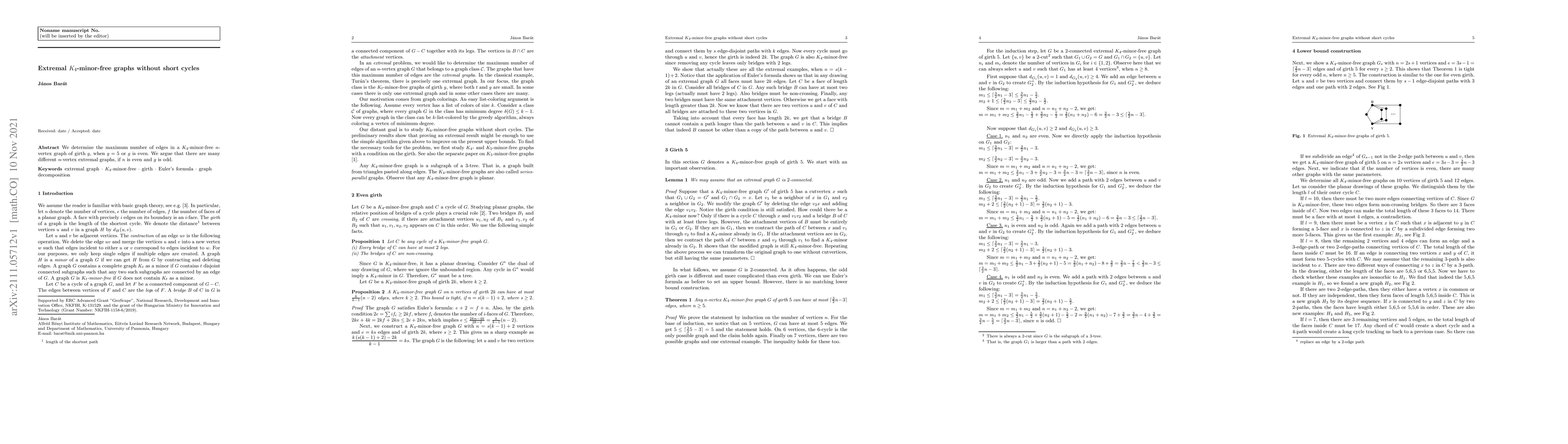 Summary: This paper determines the maximum number of edges in $K_4$-minor-free graphs with girth $g=5$ or even, showing that optimal graphs can vary significantly when $n$ is even and $g$ is odd.
