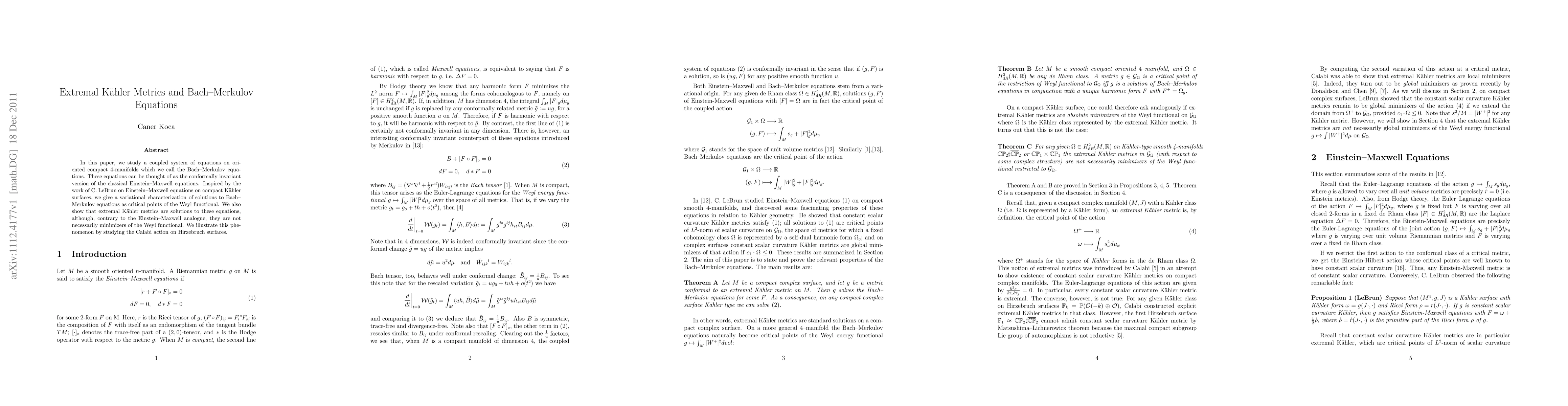 In this paper, we study a coupled system of equations on oriented compact 4-manifolds which we call the Bach-Merkulov equations. These equations can be thought of as the conformally invariant version of the classical Einstein-Maxwell equations in general relativity. Inspired by the work of C. LeBrun on Einstein-Maxwell equations on compact Kaehler surfaces, we give a variational characterization of solutions to Bach-Merkulov equations as critical points of the Weyl functional. We also show that extremal Kaehler metrics are solutions to these equations, although, contrary to the Einstein-Maxwell analogue, they are not necessarily minimizers of the Weyl functional. We illustrate this phenomenon by studying the Calabi action on Hirzebruch surfaces.