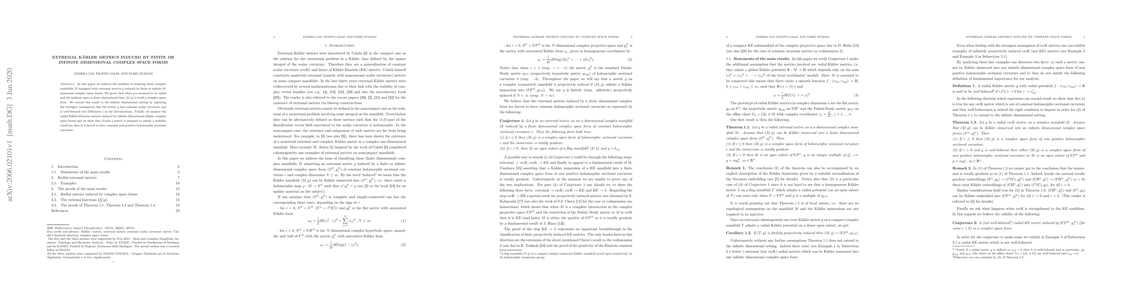 In this paper we address the problem of studying those complex manifolds $M$ equipped with extremal metrics $g$ induced by finite or infinite dimensional complex space forms. We prove that when $g$ is assumed to be radial and the ambient space is finite dimensional then $(M, g)$ is itself a complex space form. We extend this result to the infinite dimensional setting by imposing the strongest assumption that the metric $g$ has constant scalar curvature and is well-behaved (see Definition 1 in the Introduction). Finally, we analyze the radial Kaehler-Einstein metrics induced by infinite dimensional elliptic complex space forms and we show that if such a metric is assumed to satisfy a stability condition then it is forced to have constant non-positive holomorphic sectional curvature.