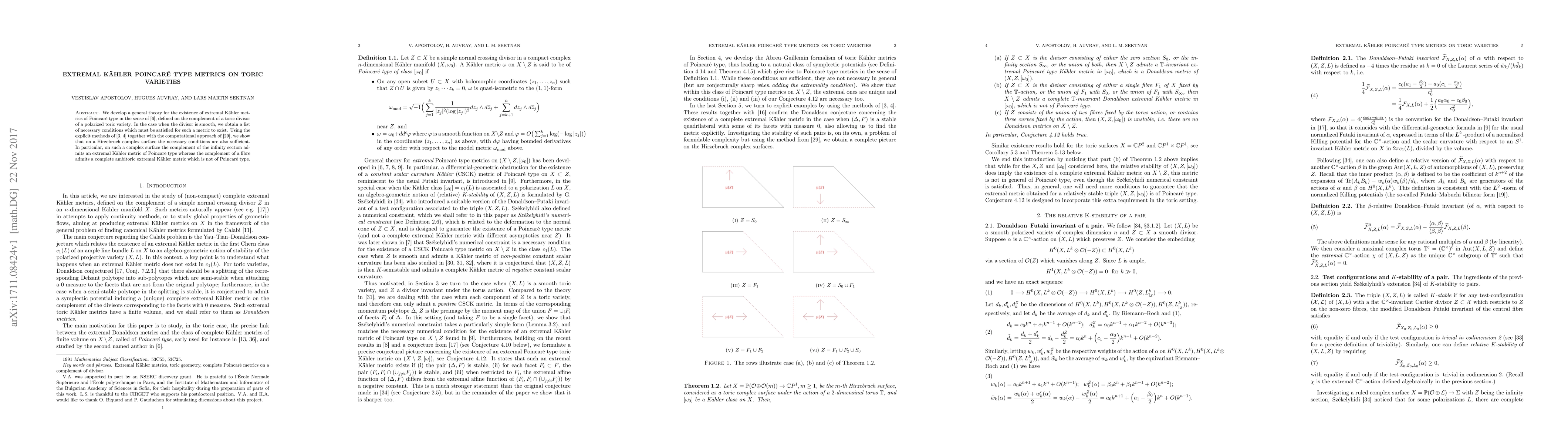 This paper develops a theory for extremal Kähler Poincaré type metrics on toric varieties, deriving necessary conditions for their existence. It proves that these conditions are also sufficient on Hirzebruch complex surfaces, identifying specific metrics for different toric complements.