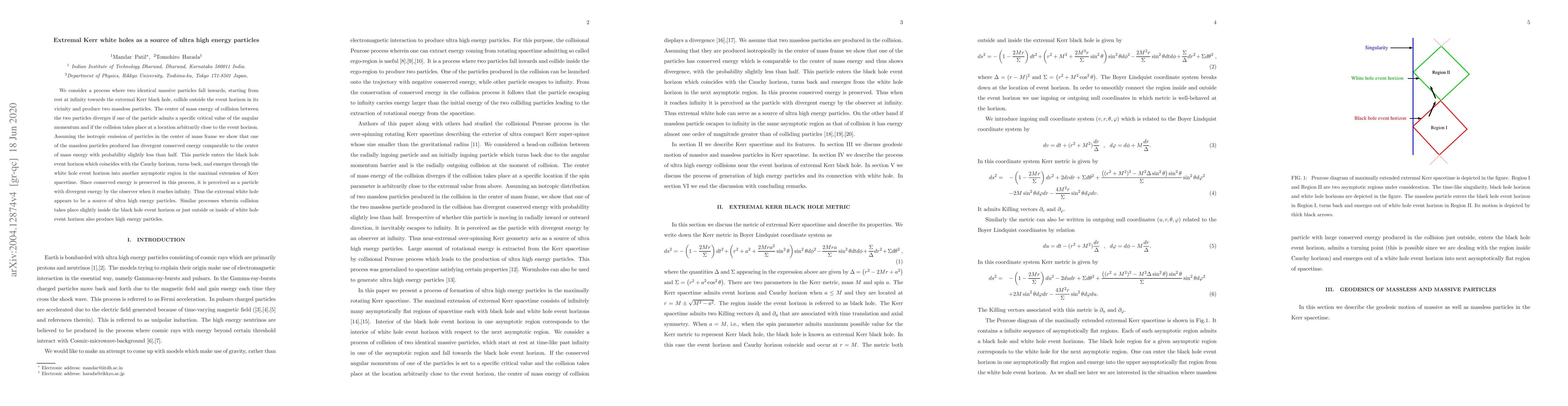 We consider a process where two identical massive particles fall inwards, starting from rest at infinity towards the extremal Kerr black hole, collide outside the event horizon in its vicinity and produce two massless particles. The center of mass energy of collision between the two particles diverges if one of the particle admits a specific critical value of the angular momentum and if the collision takes place at a location arbitrarily close to the event horizon. Assuming the isotropic emission of particles in the center of mass frame we show that one of the massless particles produced has divergent conserved energy comparable to the center of mass energy with probability slightly less than half. This particle enters the black hole event horizon which coincides with the Cauchy horizon, turns back, and emerges through the white hole event horizon into another asymptotic region in the maximal extension of Kerr spacetime. Since conserved energy is preserved in this process, it is perceived as a particle with divergent energy by the observer when it reaches infinity. Thus the extremal white hole appears to be a source of ultra high energy particles. Similar processes wherein collision takes place slightly inside the black hole event horizon or just outside or inside of white hole event horizon also produce high energy particles.