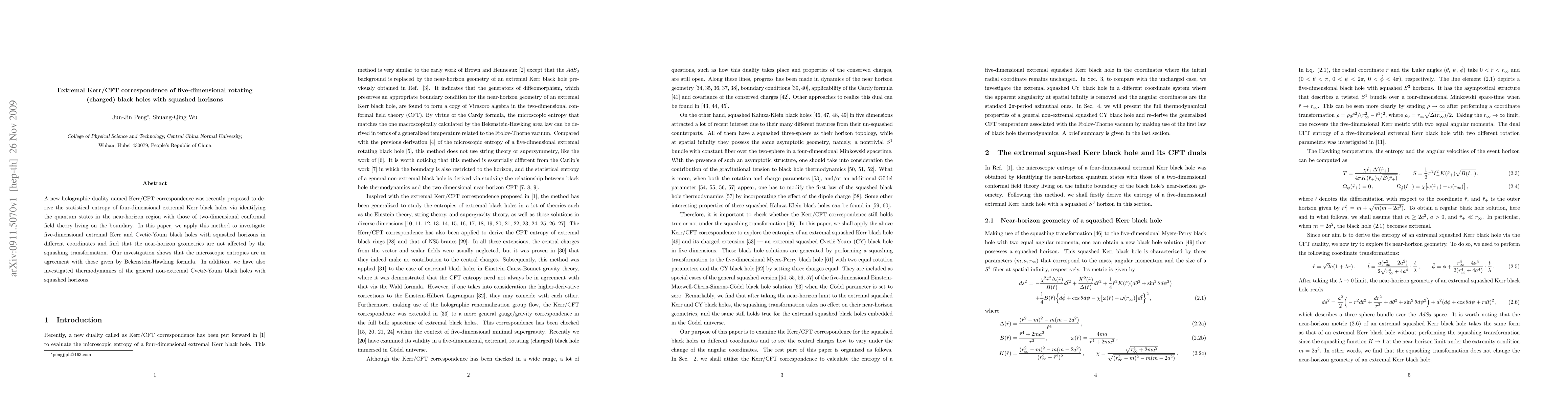 Summary: This paper extends the Kerr/CFT correspondence to five-dimensional extremal Kerr and Cveti\v{c}-Youm black holes with squashed horizons, confirming that near-horizon geometries remain unaffected by squashing, and verifies microscopic entropy agreement with the Bekenstein-Hawking formula. Additionally, it explores thermodynamics for non-extremal Cveti\v{c}-Youm black holes with squashed horizons.