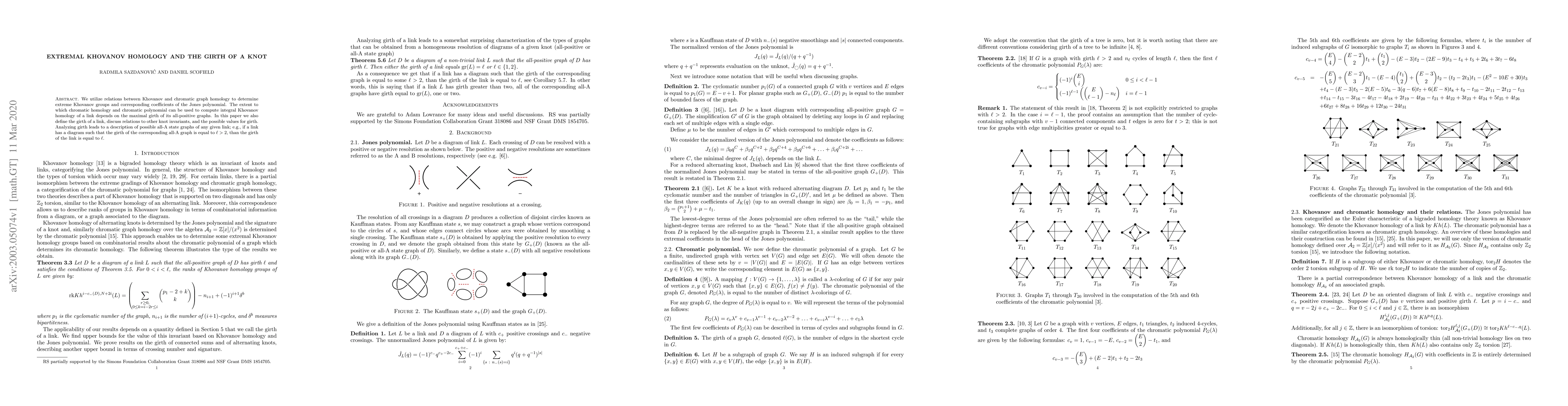 This paper explores the connection between extremal Khovanov homology and the girth of a knot, using Khovanov and chromatic graph homology to determine extreme Khovanov groups and Jones polynomial coefficients. It defines the girth of a link and discusses its relation to other knot invariants, showing that a link's girth can be determined by the maximal girth of its all-positive graphs.