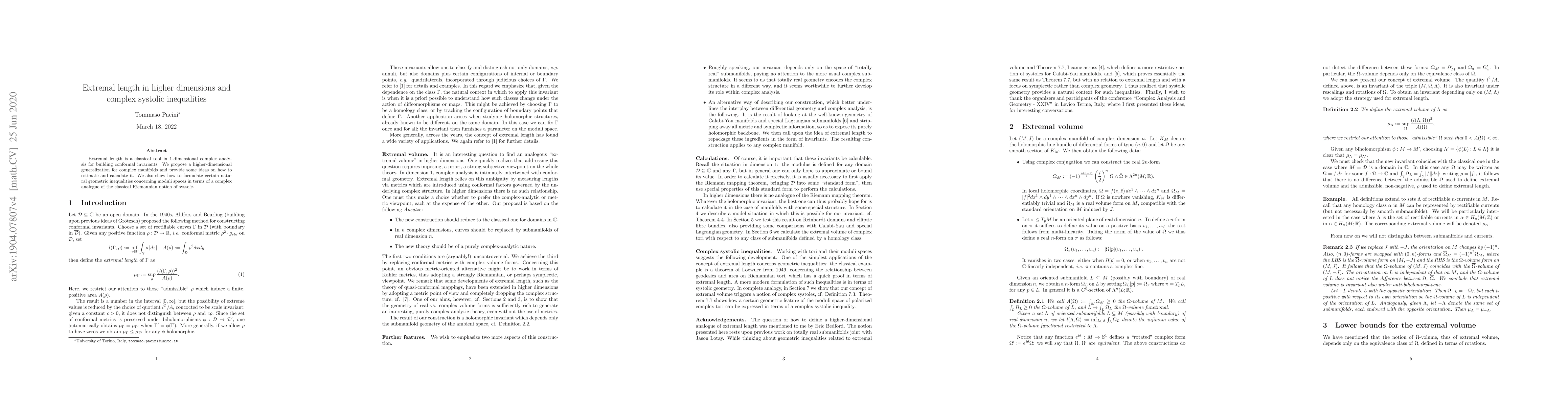 Extremal length is a classical tool in 1-dimensional complex analysis for building conformal invariants. We propose a higher-dimensional generalization for complex manifolds and provide some ideas on how to estimate and calculate it. We also show how to formulate certain natural geometric inequalities concerning moduli spaces in terms of a complex analogue of the classical Riemannian notion of systole.