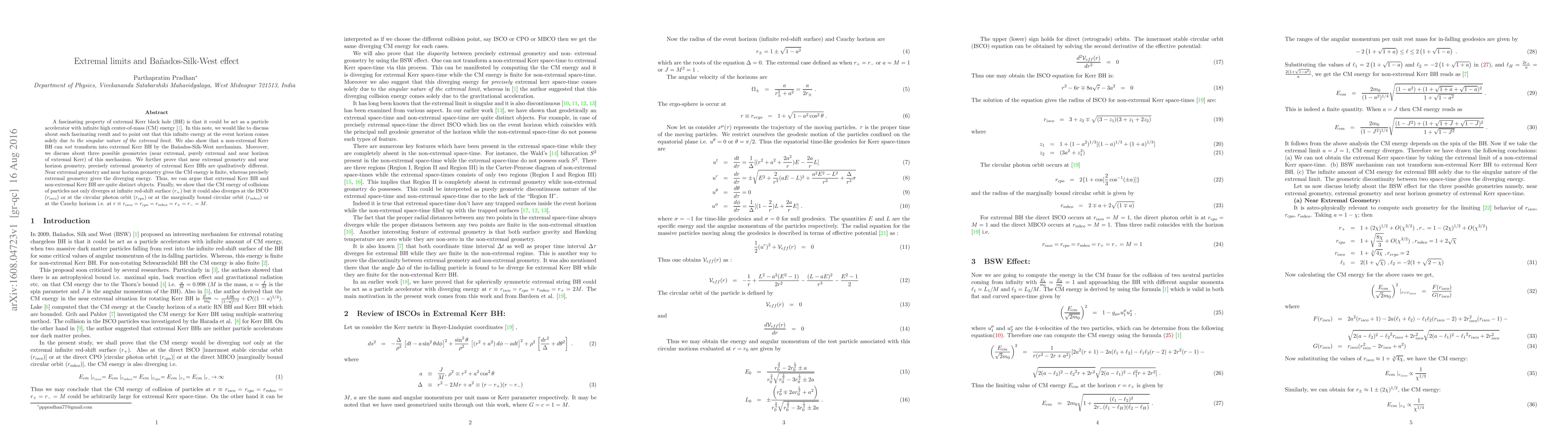 A fascinating property of extremal Kerr black hole (BH) is that it could be act as a particle accelerator with infinite high center-of-mass (CM) energy \cite{bsw}. In this note, we would like to discuss about such fascinating result and to point out that this infinite energy at the event horizon comes solely due \emph{to the singular nature of the extremal limit}. We also show that a non-extremal Kerr BH can \emph{not} transform into extremal Kerr BH by the Ba\~{n}ados-Silk-West mechanism. Moreover, we discuss about three possible geometries (near extremal, purely extremal and near horizon of extremal Kerr) of this mechanism. We further prove that near extremal geometry and near horizon geometry, precisely extremal geometry of extremal Kerr BHs are qualitatively different. Near extremal geometry and near horizon geometry gives the CM energy is finite, whereas precisely extremal geometry gives the diverging energy. Thus, we can argue that extremal Kerr BH and non-extremal Kerr BH are quite distinct objects. Finally, we show that the CM energy of collisions of particles not only diverges at infinite red-shift surface ($r_{+}$) but it could also diverges at the ISCO ($r_{isco}$) or at the circular photon orbit ($r_{cpo}$) or at the marginally bound circular orbit ($r_{mbco}$) or at the Cauchy horizon i.e. at $r \equiv r_{isco}=r_{cpo}=r_{mbco}=r_{+}=r_{-}=M$.