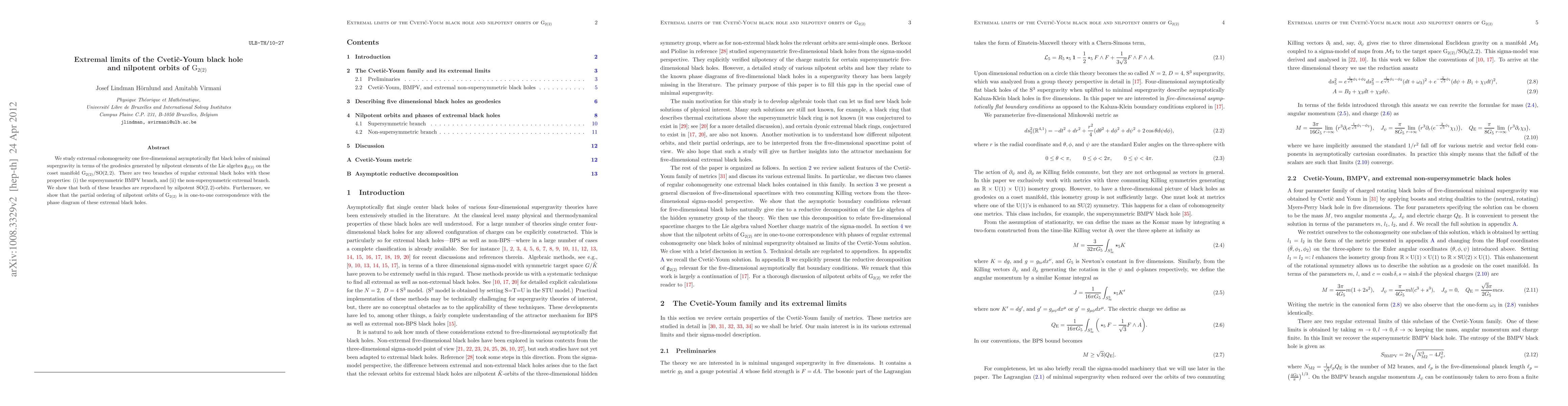 We study extremal cohomogeneity one five-dimensional asymptotically flat black holes of minimal supergravity in terms of the geodesics generated by nilpotent elements of the Lie algebra g2(2) on the coset manifold G2(2)/SO(2,2). There are two branches of regular extremal black holes with these properties: (i) the supersymmetric BMPV branch, and (ii) the non-supersymmetric extremal branch. We show that both of these branches are reproduced by nilpotent SO(2,2)-orbits. Furthermore, we show that the partial ordering of nilpotent orbits of G2(2) is in one-to-one correspondence with the phase diagram of these extremal black holes.