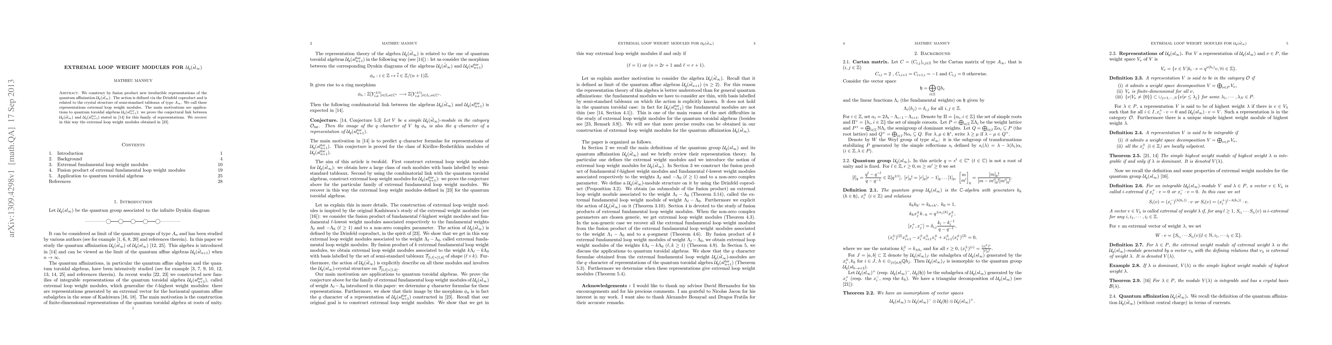 We construct by fusion product new irreducible representations of the quantum affinization $U_q(\hat{sl}_\infty)$. The action is defined via the Drinfeld coproduct and is related to the crystal structure of semi-standard tableaux of type $A_\infty$. We call these representations extremal loop weight modules. The main motivations are applications to quantum toroidal algebras $U_q(sl_{n+1}^{tor})$: we prove the conjectural link between $U_q(\hat{sl}_\infty)$ and $U_q(sl_{n+1}^{tor})$ stated in [14] for this family of representations. We recover in this way the extremal loop weight modules obtained in [23].