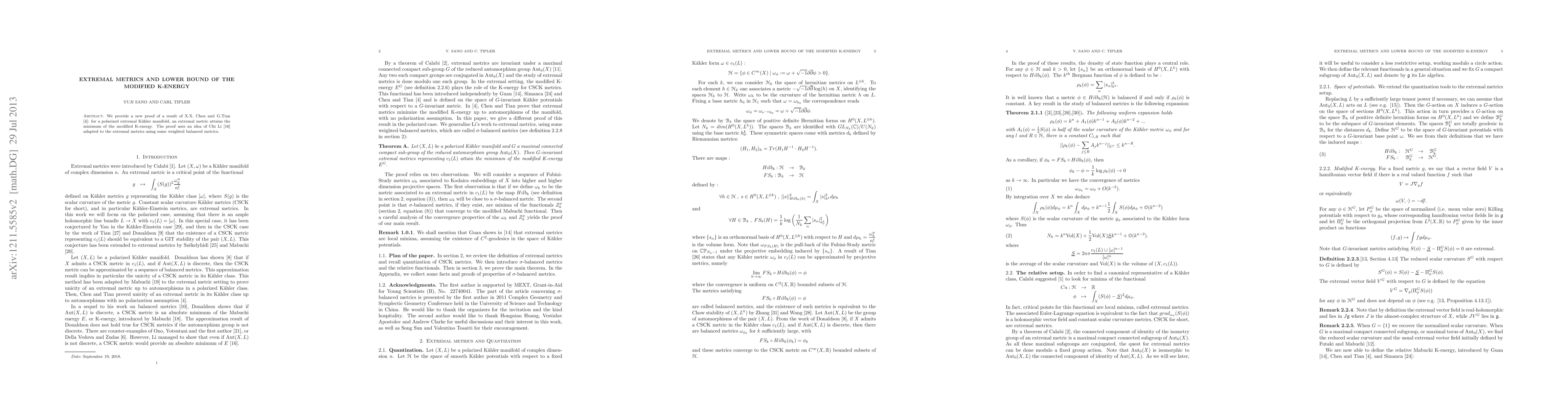 We provide a new proof of a result of X.X.Chen and G.Tian : for a polarized extremal K\"ahler manifold, an extremal metric attains the minimum of the modified K-energy. The proof uses an idea of C.Li adapted to the extremal metrics using some weighted balanced metrics.
