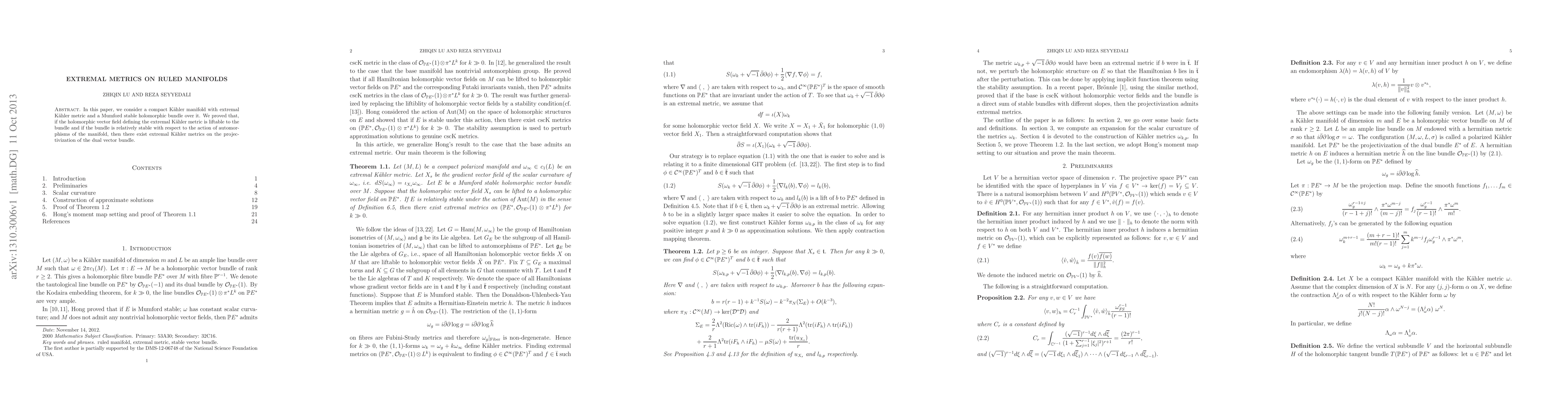 Researchers have found that if a compact Kahler manifold has an extremal metric and a specific type of bundle over it, then new extremal metrics can be created on the projectivization of its dual vector bundle.