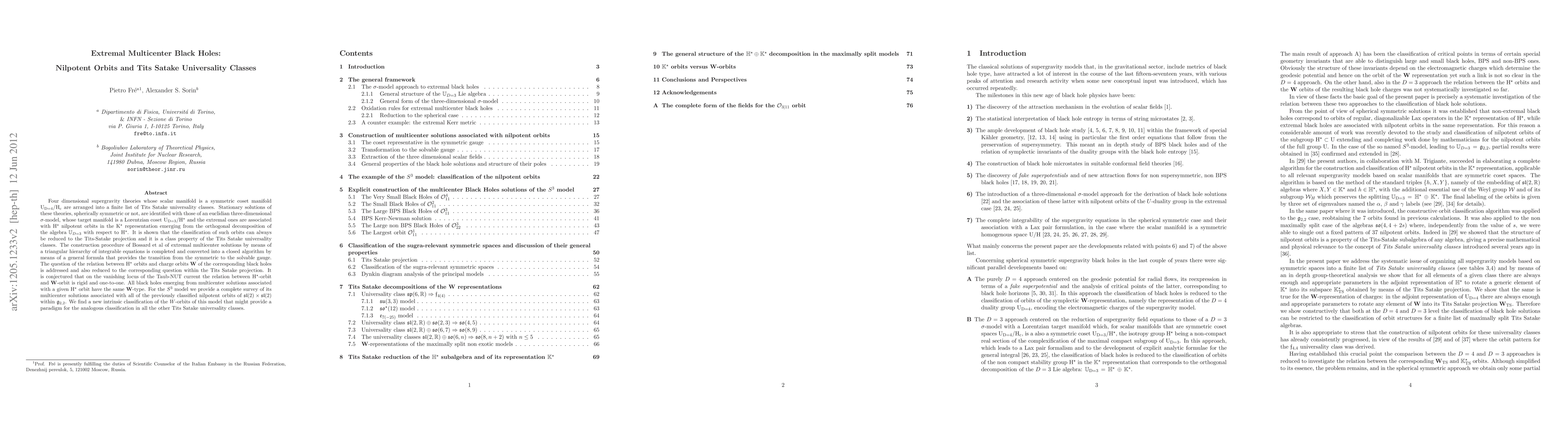 This paper classifies four-dimensional supergravity theories using Tits Satake universality classes, linking extremal black hole solutions to nilpotent orbits via a K* representation. It proposes a closed algorithm for constructing extremal multicenter solutions and conjectures a one-to-one correspondence between orbits of certain black holes and their charge orbits, suggesting uniform W-types for black holes from the same nilpotent orbit.