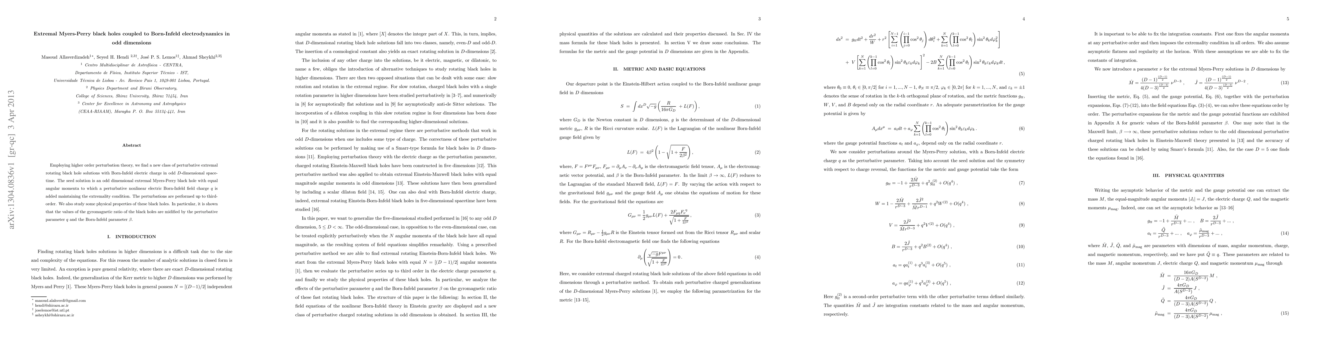 Summary: The paper presents new extremal rotating black hole solutions in odd dimensions derived from higher order perturbation theory, coupled to Born-Infeld electrodynamics. It explores the modifications to the gyromagnetic ratio due to perturbative electric charge and Born-Infeld parameters.