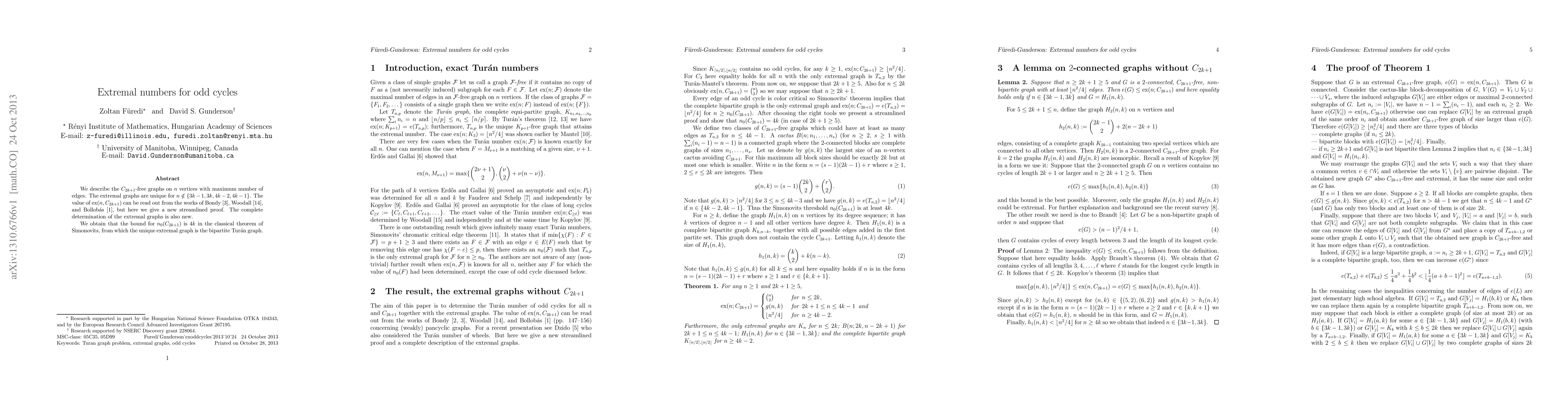 This paper determines the C_{2k+1}-free graphs on n vertices with the maximum number of edges, proving that the extremal graphs are unique except for specific values of n. It provides a streamlined proof of the extremal number ex(n,C_{2k+1}) and determines the unique extremal graph as the bipartite Turan graph for n_0(C_{2k+1}) up to 4k.