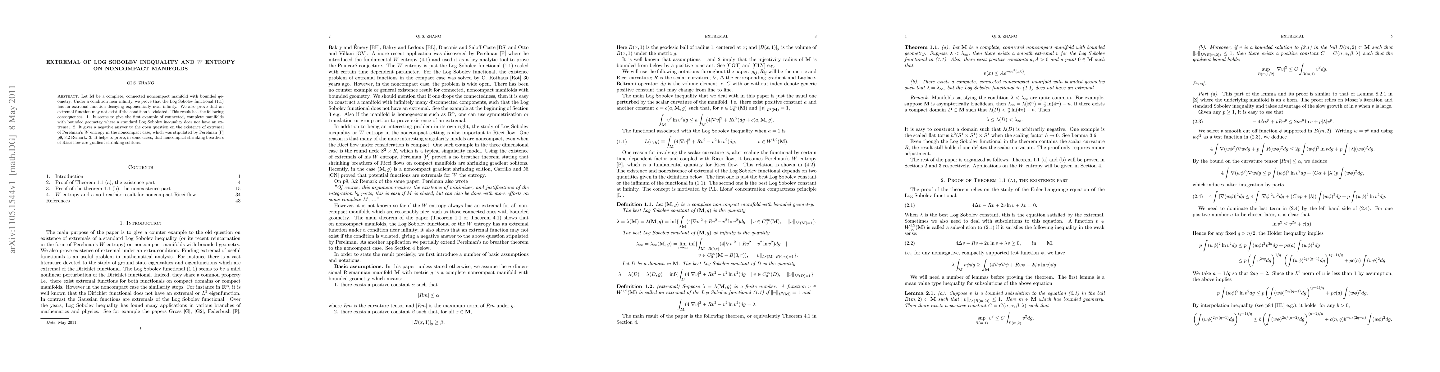 Let $\M$ be a complete, connected noncompact manifold with bounded geometry. Under a condition near infinity, we prove that the Log Sobolev functional (\ref{logfanhan}) has an extremal function decaying exponentially near infinity. We also prove that an extremal function may not exist if the condition is violated. This result has the following consequences. 1. It seems to give the first example of connected, complete manifolds with bounded geometry where a standard Log Sobolev inequality does not have an extremal. 2. It gives a negative answer to the open question on the existence of extremal of Perelman's $W$ entropy in the noncompact case, which was stipulated by Perelman \cite{P:1} p9, 3.2 Remark. 3. It helps to prove, in some cases, that noncompact shrinking breathers of Ricci flow are gradient shrinking solitons.