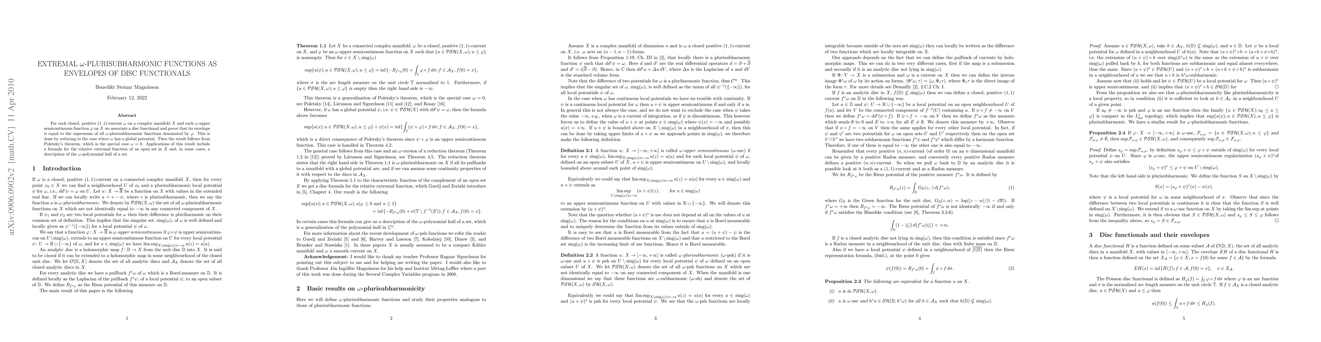 This paper associates extremal omega-plurisubharmonic functions with disc functionals on complex manifolds, proving that their envelope equals the supremum of omega-plurisubharmonic functions dominated by a given function. The result is applied to derive a formula for the relative extremal function and describe the omega-polynomial hull of a set.