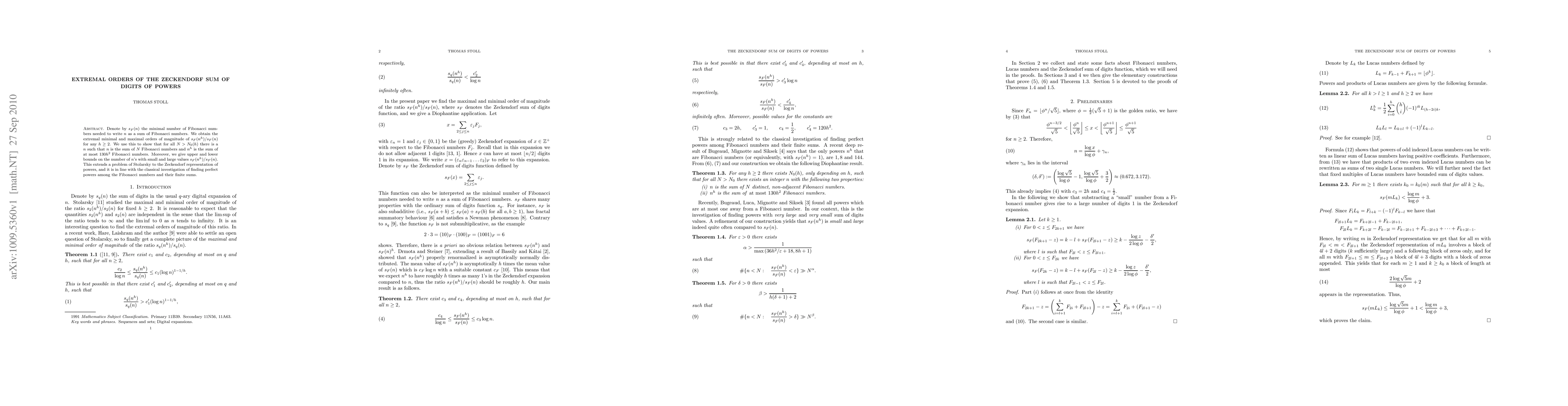This paper explores the extremal orders of the Zeckendorf sum of digits for powers, determining the minimal and maximal orders of the ratio of sums of Fibonacci numbers needed to represent n^h and n. It establishes bounds on the number of n's with specific properties regarding the Fibonacci representation of powers.