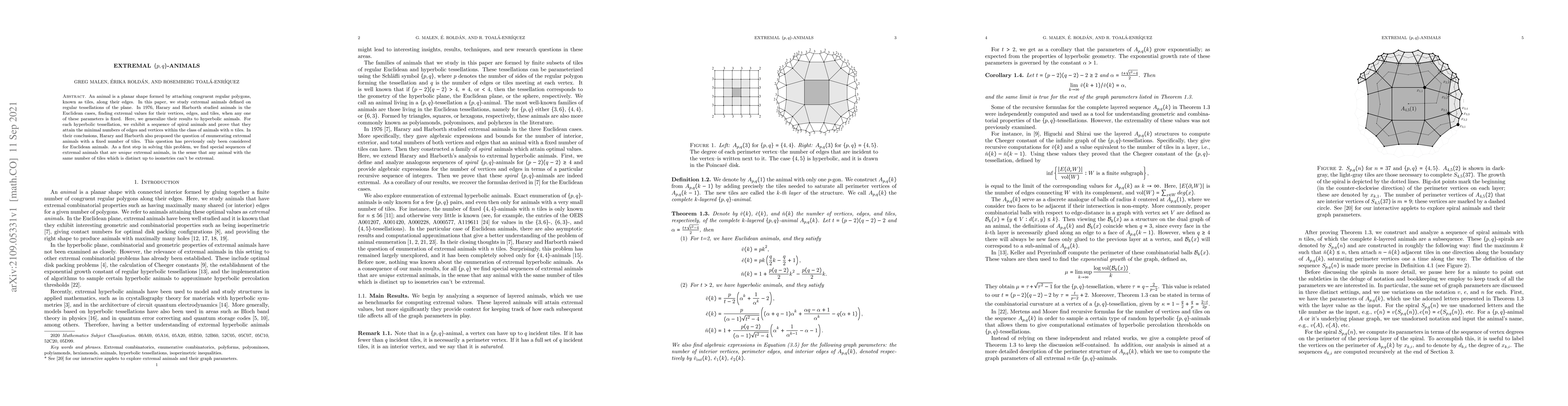 An animal is a planar shape formed by attaching congruent regular polygons, known as tiles, along their edges. In this paper, we study extremal animals defined on regular tessellations of the plane. In 1976, Harary and Harborth studied animals in the Euclidean cases, finding extremal values for their vertices, edges, and tiles, when any one of these parameters is fixed. Here, we generalize their results to hyperbolic animals. For each hyperbolic tessellation, we exhibit a sequence of spiral animals and prove that they attain the minimal numbers of edges and vertices within the class of animals with $n$ tiles. In their conclusions, Harary and Harborth also proposed the question of enumerating extremal animals with a fixed number of tiles. This question has previously only been considered for Euclidean animals. As a first step in solving this problem, we find special sequences of extremal animals that are unique extremal animals, in the sense that any animal with the same number of tiles which is distinct up to isometries can't be extremal.