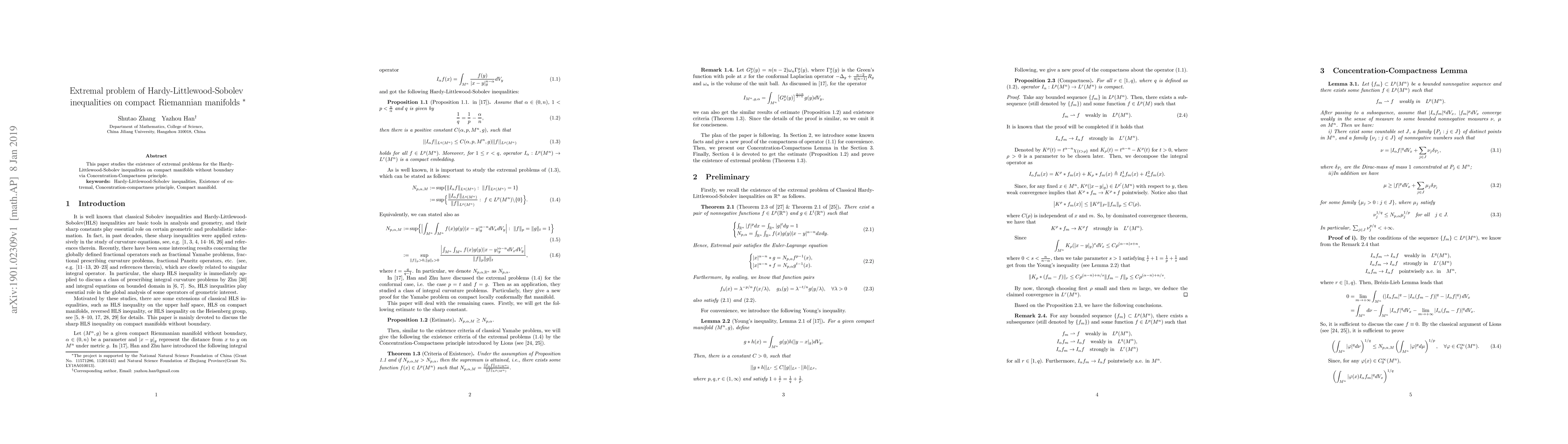 Summary: This research investigates the existence of extremal problems for Hardy-Littlewood-Sobolev inequalities on compact Riemannian manifolds without boundary, utilizing the Concentration-Compactness principle to derive its conclusions.