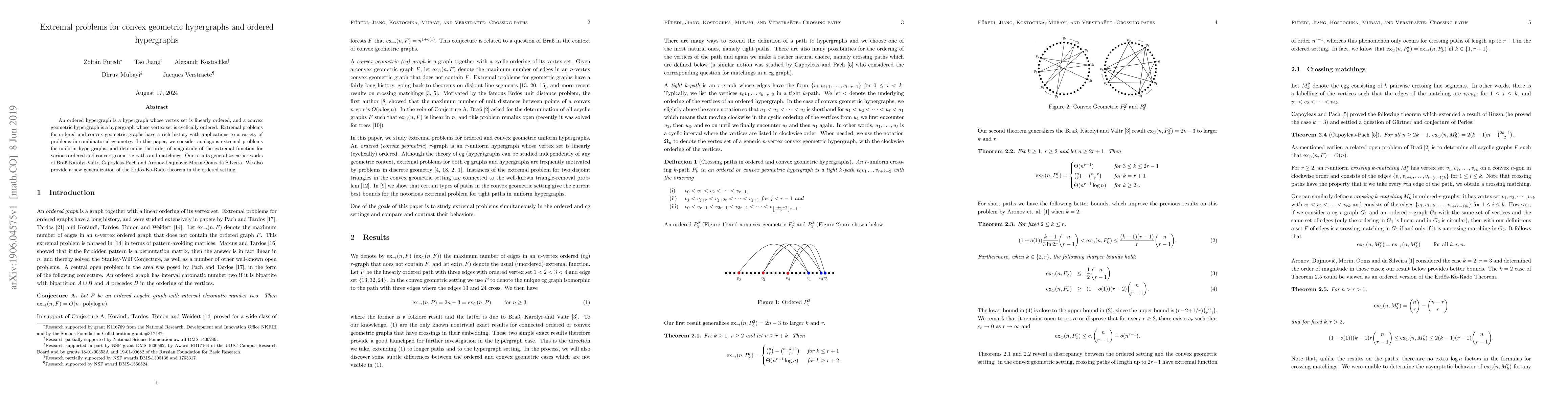 This paper explores extremal problems for uniform hypergraphs where vertices are either linearly ordered (ordered hypergraphs) or cyclically ordered (convex geometric hypergraphs), determining the order of magnitude for various paths and matchings. The findings generalize prior works and introduce a new generalization of the Erdős-Ko-Rado theorem for ordered hypergraphs.