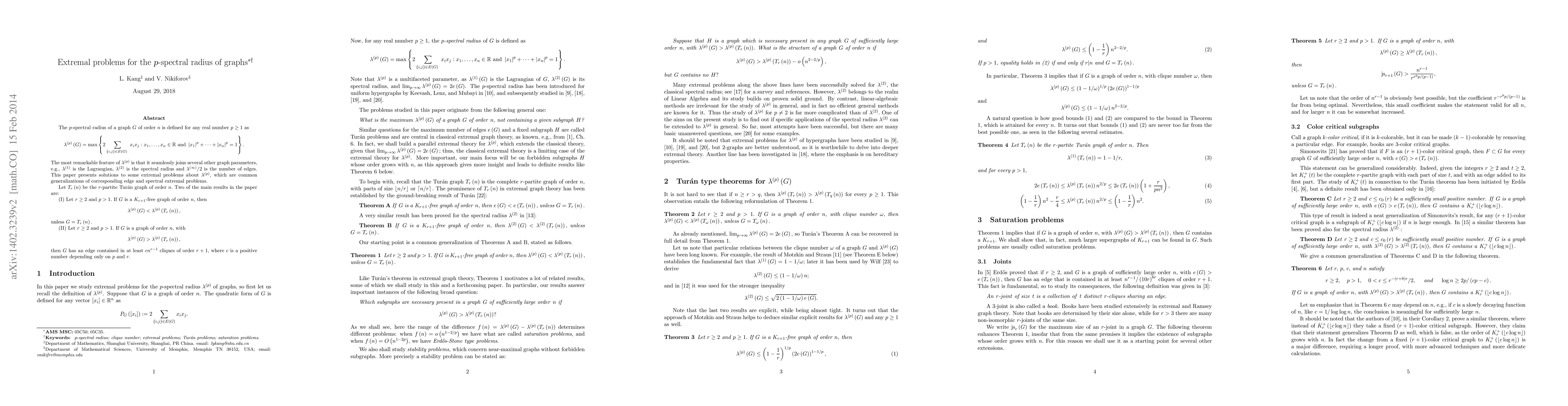 The $p$-spectral radius of a graph $G\ $of order $n$ is defined for any real number $p\geq1$ as \[ \lambda^{\left( p\right) }\left( G\right) =\max\left\{ 2\sum_{\{i,j\}\in E\left( G\right) \ }x_{i}x_{j}:x_{1},\ldots,x_{n}\in\mathbb{R}\text{ and }\left\vert x_{1}\right\vert ^{p}+\cdots+\left\vert x_{n}\right\vert ^{p}=1\right\} . \] The most remarkable feature of $\lambda^{\left( p\right) }$ is that it seamlessly joins several other graph parameters, e.g., $\lambda^{\left( 1\right) }$ is the Lagrangian, $\lambda^{\left( 2\right) }$ is the spectral radius and $\lambda^{\left( \infty\right) }/2$ is the number of edges. This paper presents solutions to some extremal problems about $\lambda^{\left( p\right) }$, which are common generalizations of corresponding edge and spectral extremal problems. Let $T_{r}\left( n\right) $ be the $r$-partite Tur\'{a}n graph of order $n.$ Two of the main results in the paper are: (I) Let $r\geq2$ and $p>1.$ If $G$ is a $K_{r+1}$-free graph of order $n,$ then \[ \lambda^{\left( p\right) }\left( G\right) <\lambda^{\left( p\right) }\left( T_{r}\left( n\right) \right) , \] unless $G=T_{r}\left( n\right) .$ (II) Let $r\geq2$ and $p>1.$ If $G\ $is a graph of order $n,$ with \[ \lambda^{\left( p\right) }\left( G\right) >\lambda^{\left( p\right) }\left( T_{r}\left( n\right) \right) , \] then $G$ has an edge contained in at least $cn^{r-1}$ cliques of order $r+1,$ where $c$ is a positive number depending only on $p$ and $r.$