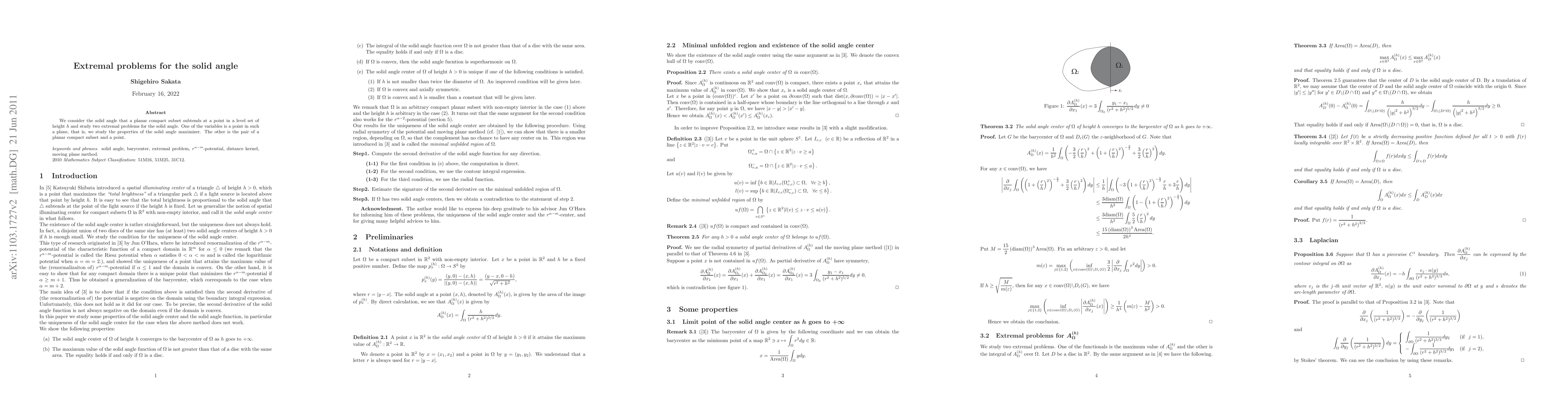 We consider the solid angle that a planar compact subset subtends at a point in a level set of height h and study two extremal problems for the solid angle. One of the variables is a point in such a plane, that is, we study the properties of the solid angle maximizer. The other is the pair of a planar compact subset and a point.