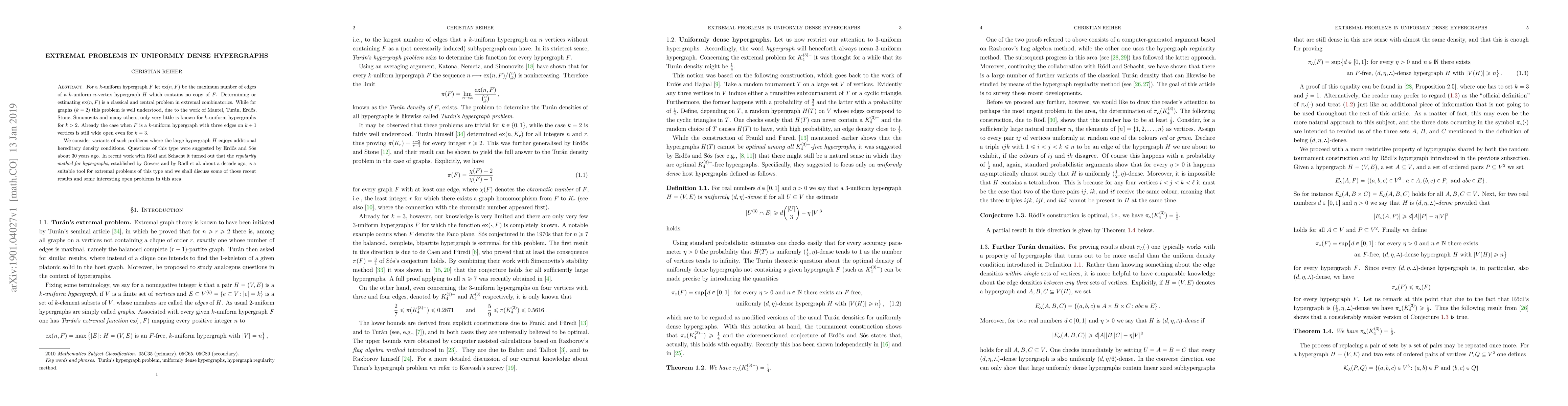 Researchers study extremal problems in uniformly dense hypergraphs, aiming to understand how many edges can be added to a large graph without containing a specific pattern, and explore the application of the regularity method for solving these problems.