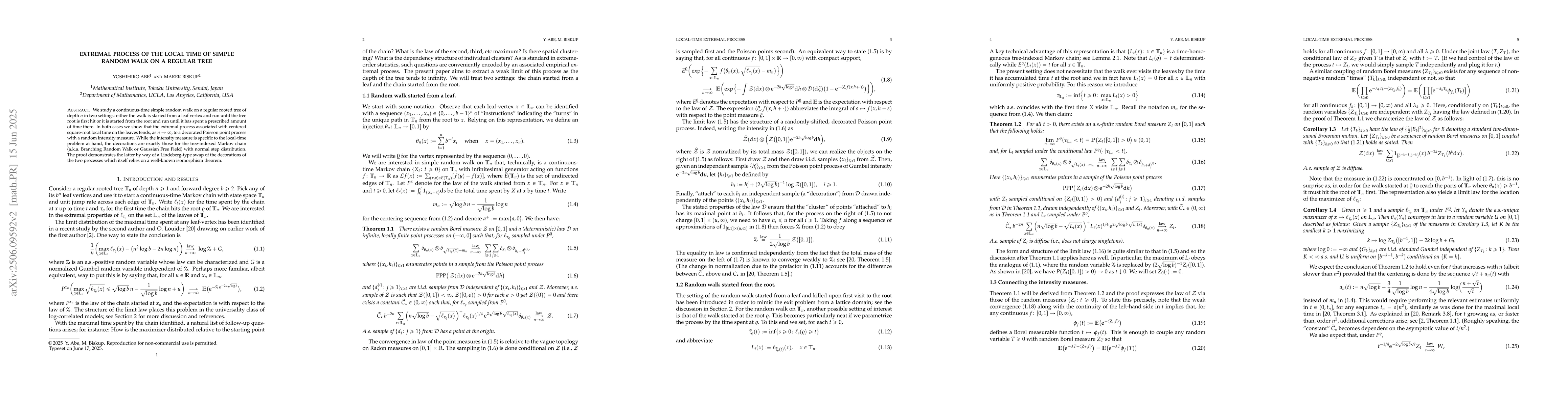 We study a continuous-time simple random walk on a regular rooted tree of depth $n$ in two settings: either the walk is started from a leaf vertex and run until the tree root is first hit or it is started from the root and run until it has spent a prescribed amount of time there. In both cases we show that the extremal process associated with centered square-root local time on the leaves tends, as $n\to\infty$, to a decorated Poisson point process with a random intensity measure. While the intensity measure is specific to the local-time problem at hand, the decorations are exactly those for the tree-indexed Markov chain (a.k.a. Branching Random Walk or Gaussian Free Field) with normal step distribution. The proof demonstrates the latter by way of a Lindeberg-type swap of the decorations of the two processes which itself relies on a well-known isomorphism theorem.