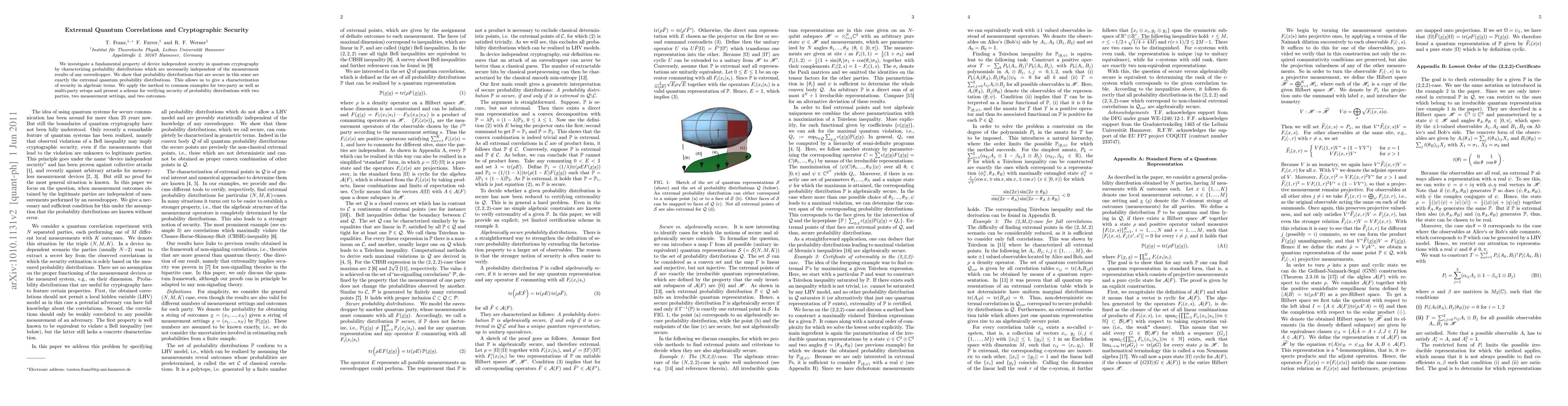 We investigate a fundamental property of device independent security in quantum cryptography by characterizing probability distributions which are necessarily independent of the measurement results of any eavesdropper. We show that probability distributions that are secure in this sense are exactly the extremal quantum probability distributions. This allows us to give a characterization of security in algebraic terms. We apply the method to common examples for two-party as well as multi-party setups and present a scheme for verifying security of probability distributions with two parties, two measurement settings, and two outcomes.