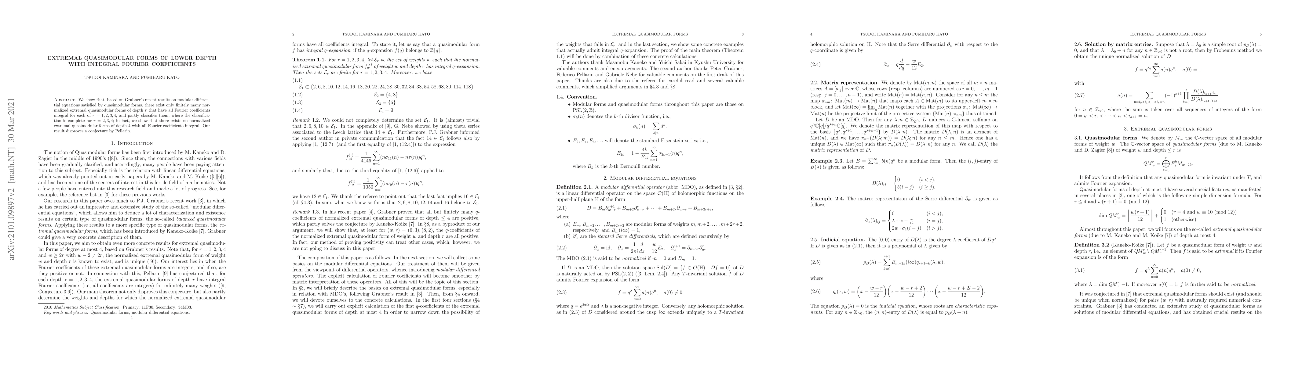 This research demonstrates the finite existence of normalized extremal quasimodular forms of depths $r=1,2,3,4$ with integral Fourier coefficients, proving only finitely many such forms exist for each depth and classifying them completely for $r=2,3,4$. Notably, it disproves a conjecture by Pellarin by showing there are no normalized extremal quasimodular forms of depth $4$ with all integral Fourier coefficients.
