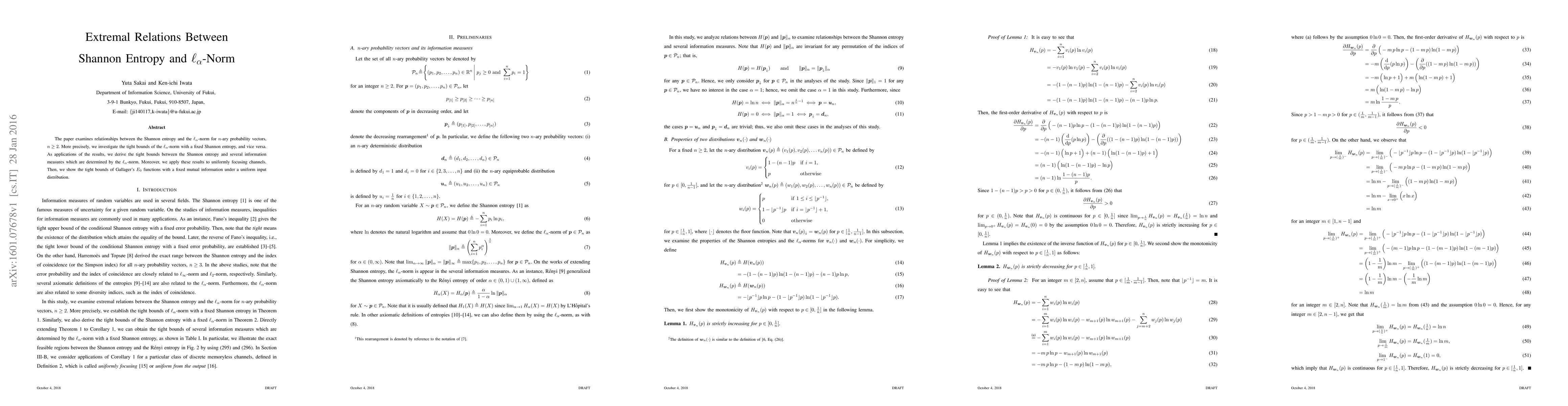 This paper investigates extremal relations between Shannon entropy and $\ell_{\alpha}$-norm for $n$-ary probability vectors, deriving tight bounds for both. It also applies these findings to derive bounds for Rényi entropy, Tsallis entropy, and diversity indices, and demonstrates their utility in uniformly focusing channels and Gallager's $E_{0}$ functions.