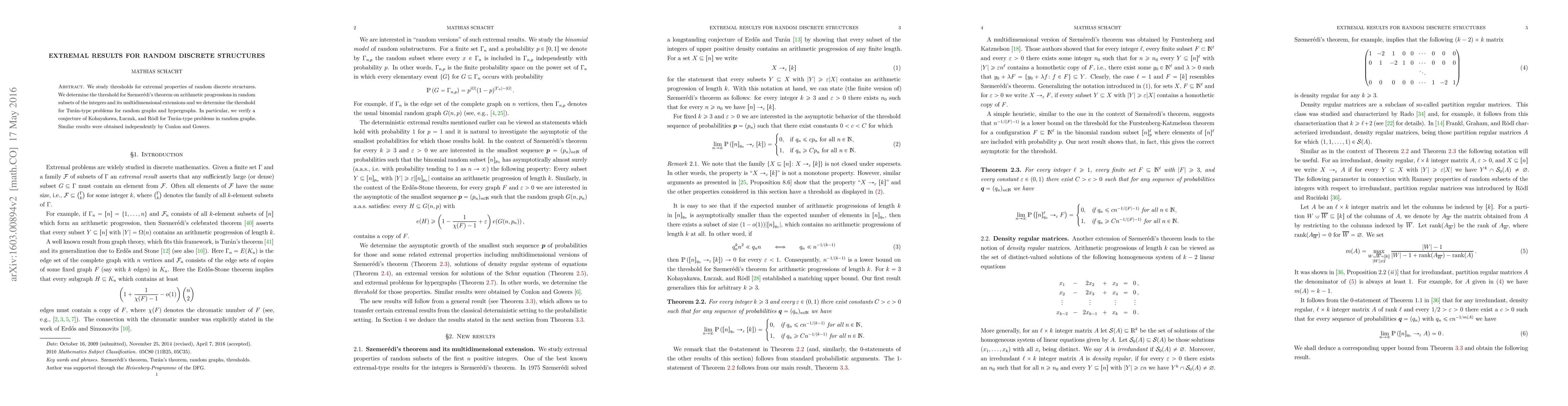 Researchers studied thresholds for extremal properties in random discrete structures, verifying a conjecture on Turan-type problems in random graphs and finding results similar to Conlon and Gowers' work.