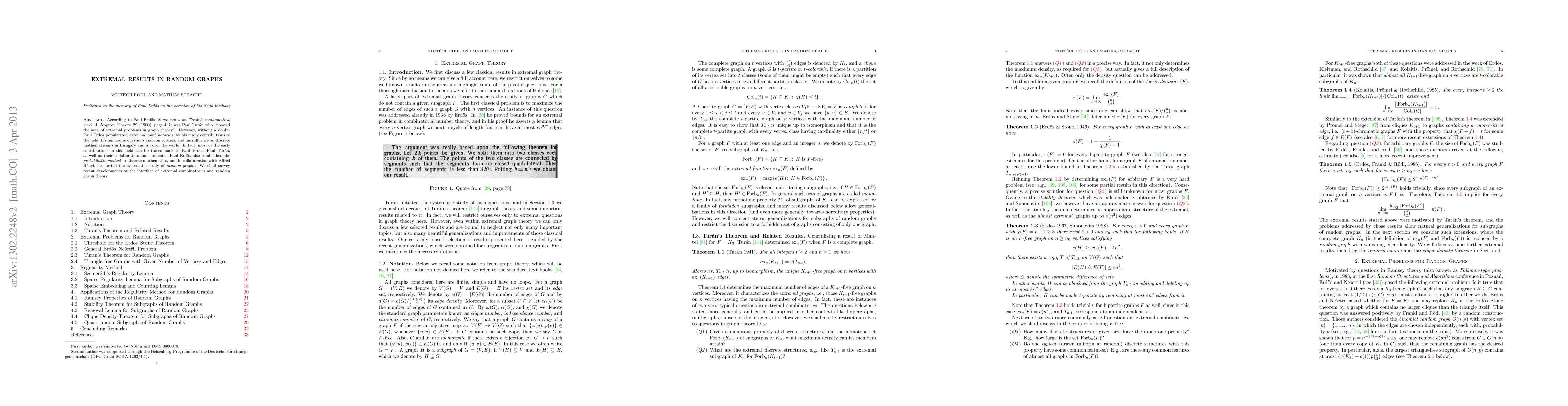 The paper surveys recent developments at the interface of extremal combinatorics and random graph theory, focusing on results related to Paul Erdős and Paul Turán's foundational work in extremal problems and graph theory, as well as the probabilistic method introduced by Erdős and its application to random graphs in collaboration with Alfréd Rényi.