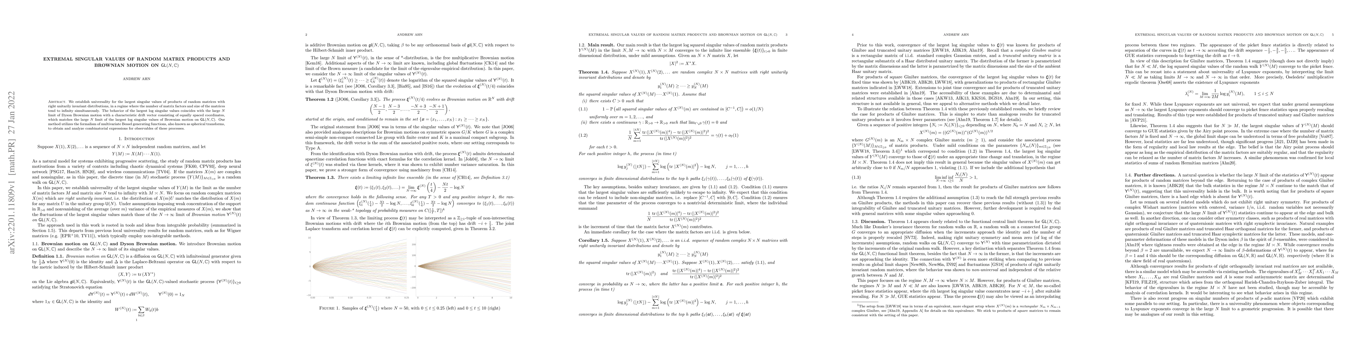 We establish universality for the largest singular values of products of random matrices with right unitarily invariant distributions, in a regime where the number of matrix factors and size of the matrices tend to infinity simultaneously. The behavior of the largest log singular values coincides with the large N limit of Dyson Brownian motion with a characteristic drift vector consisting of equally spaced coordinates, which matches the large N limit of the largest log singular values of Brownian motion on GL(N, C). Our method utilizes the formalism of multivariate Bessel generating functions, also known as spherical transforms, to obtain and analyze combinatorial expressions for observables of these processes.