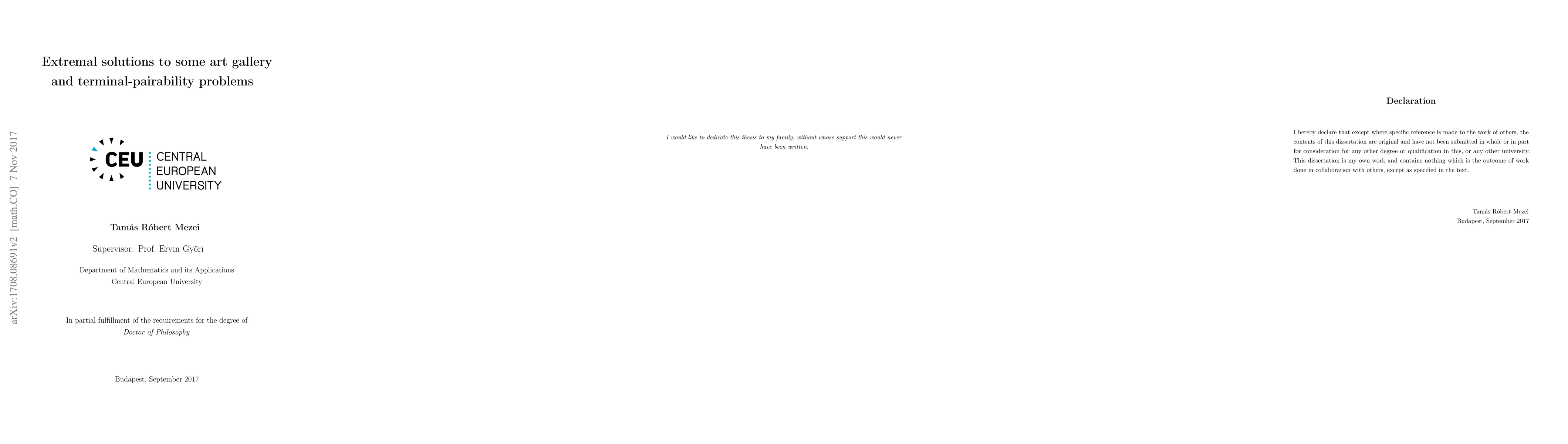 This research employs an extremal approach to solve art gallery and terminal-pairability problems, demonstrating minimal compromise in solution efficacy. It establishes sharp bounds for partitioning orthogonal polygons and introduces a new connection between mobile and stationary guards, leading to an $\frac83$-approximation algorithm. Additionally, it significantly improves lower bounds for the maximum degree of realizable demand graphs in complete base graphs and shows efficient routing of edge-disjoint paths in complete grid graphs.