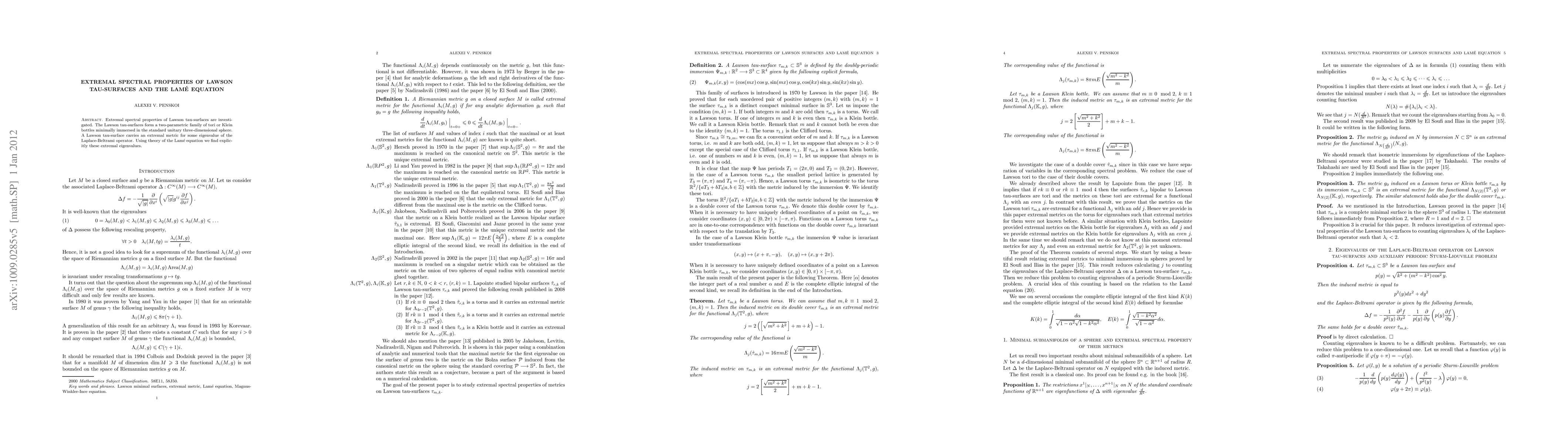 Extremal spectral properties of Lawson tau-surfaces are investigated. The Lawson tau-surfaces form a two-parametric family of tori or Klein bottles minimally immersed in the standard unitary three-dimensional sphere. A Lawson tau-surface carries an extremal metric for some eigenvalue of the Laplace-Beltrami operator. Using theory of the Lam\'e equation we find explicitly these extremal eigenvalues.