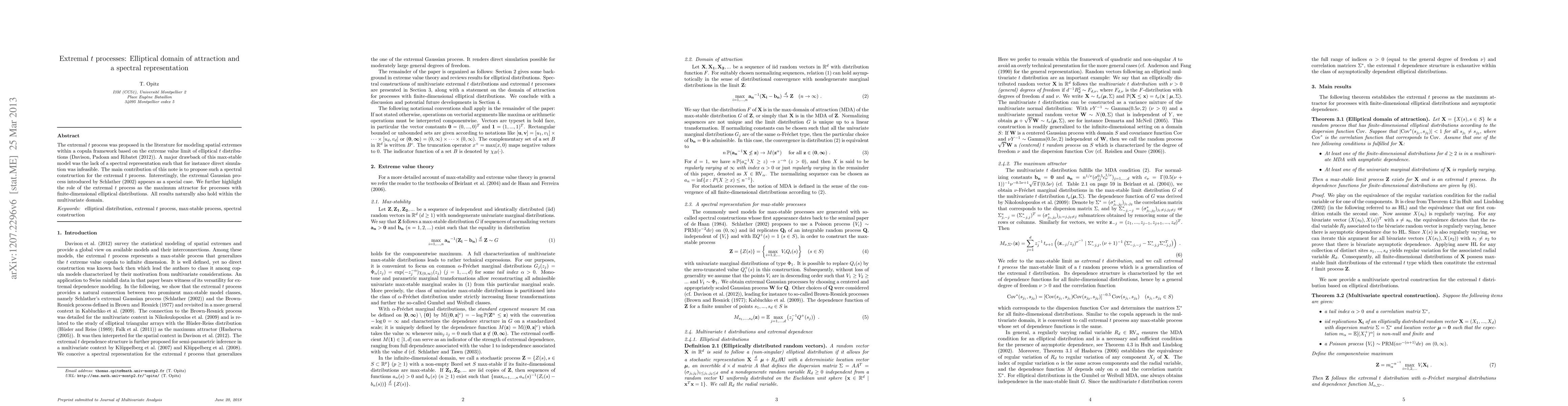 This paper proposes a spectral representation for the extremal t process, enabling feasible simulation, and highlights its role as the maximum attractor for processes with finite-dimensional elliptical distributions, with the extremal Gaussian process as a special case. The results extend naturally to the multivariate domain.