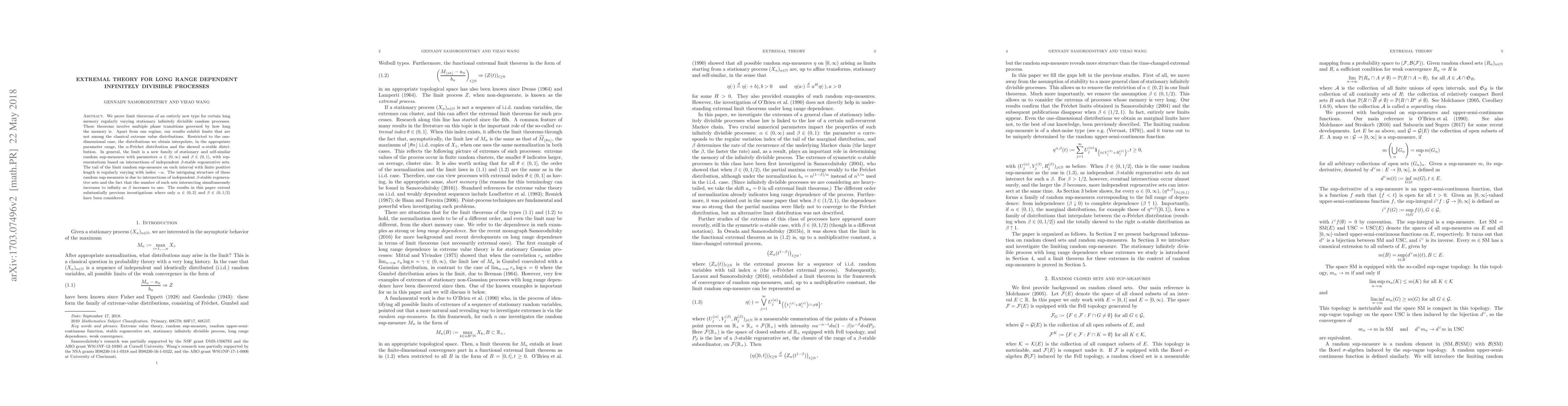This paper proves novel limit theorems for long memory, infinitely divisible random processes, revealing new types of extreme value distributions that interpolate between $\alpha$-Fr\'echet and skewed $\alpha$-stable distributions. The results introduce a new family of self-similar random sup-measures with parameters $\alpha$ and $\beta$, extending previous studies beyond the $\alpha\in(0,2)$ and $\beta\in(0,1/2)$ range.