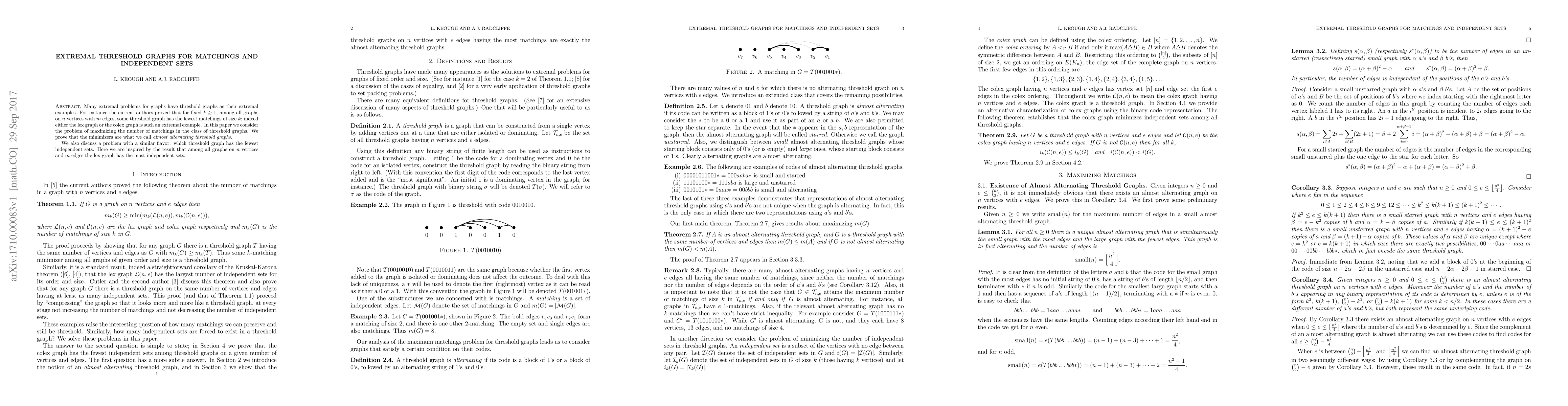 This paper explores extremal threshold graphs concerning matchings and independent sets. It proves that almost alternating threshold graphs minimize the number of matchings, while it investigates which threshold graph maximizes the number of independent sets, inspired by the lex graph's property of having the most independent sets among all graphs with a given number of vertices and edges.